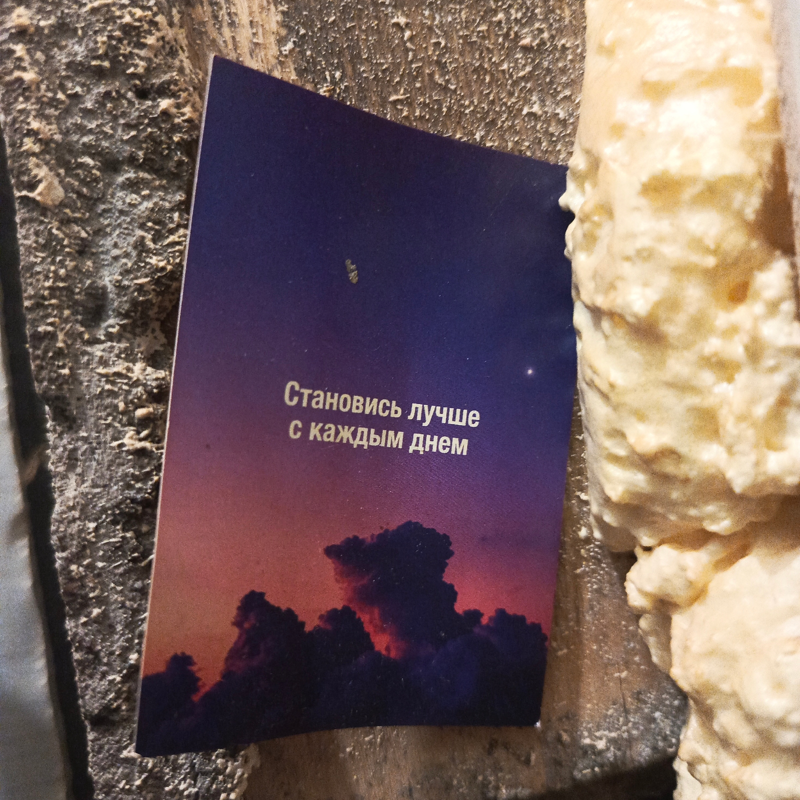 A business card leaning against a rough, textured surface and a mass of pale, porous material. The card features a night sky with dark clouds at the bottom, transitioning into a gradient of pink and p…read more