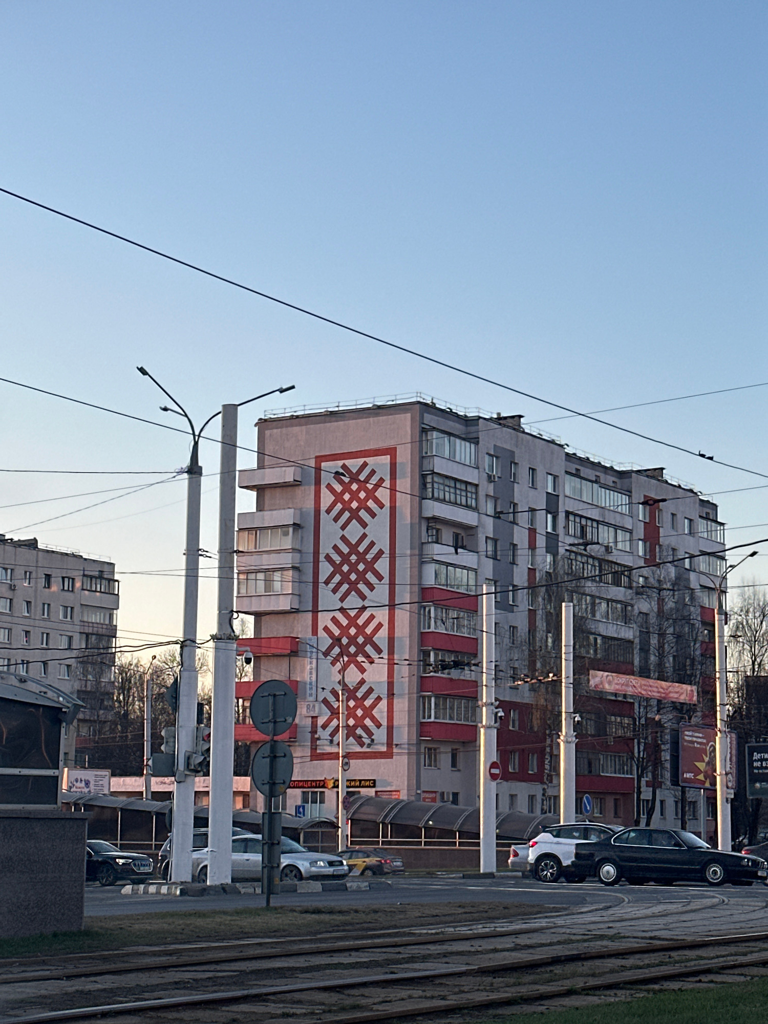 The image shows a street scene in Vitsebsk, Belarus. A large, multi-story apartment building dominates the view. Its facade is partially decorated with a traditional geometric pattern in red and white…read more
