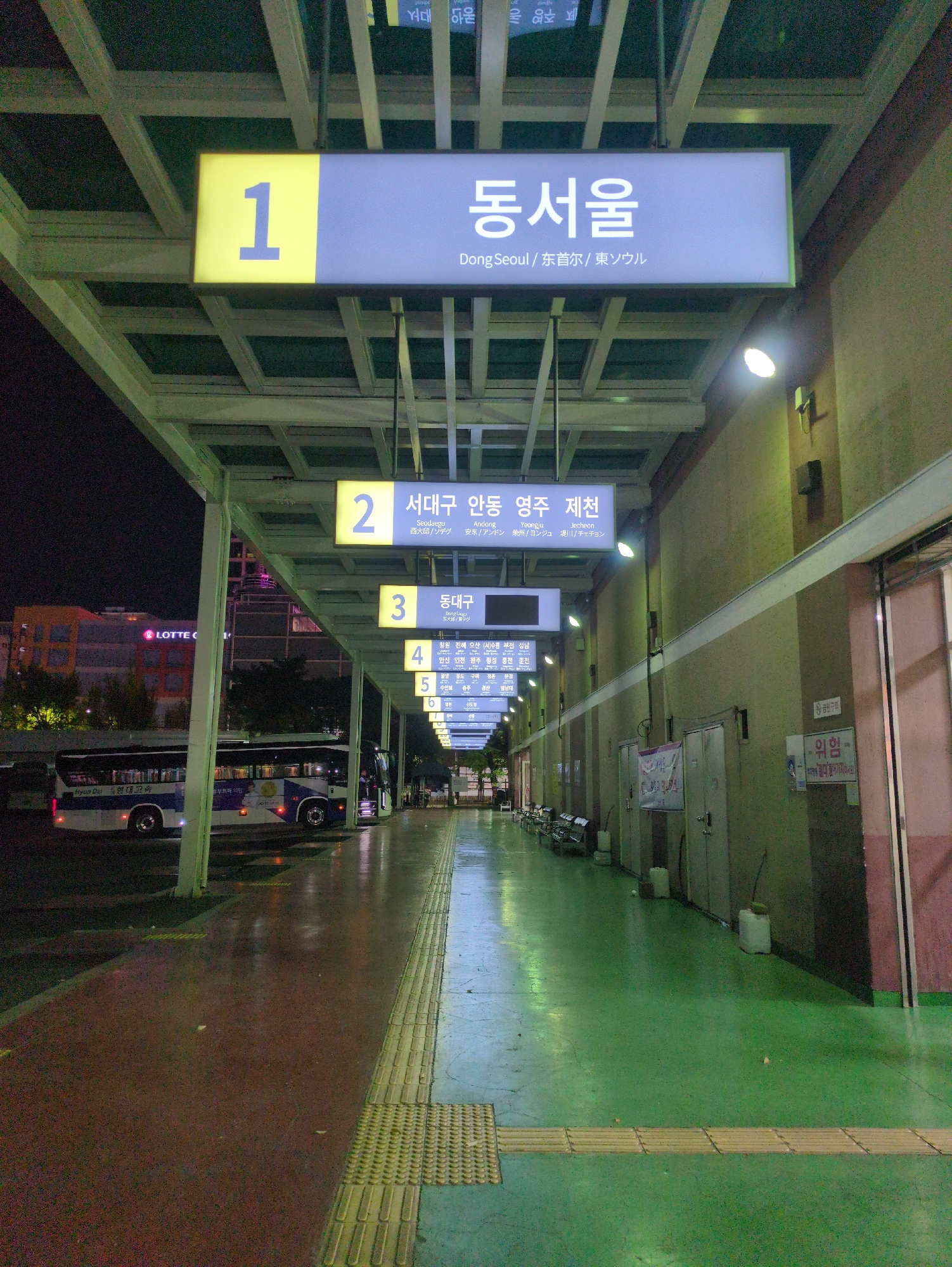 The image depicts a bus terminal in South Korea, potentially in Ulsan, although the presence of "Dong Seoul" suggests the terminal is in Seoul. It shows a series of numbered bays or platforms, with si…read more
