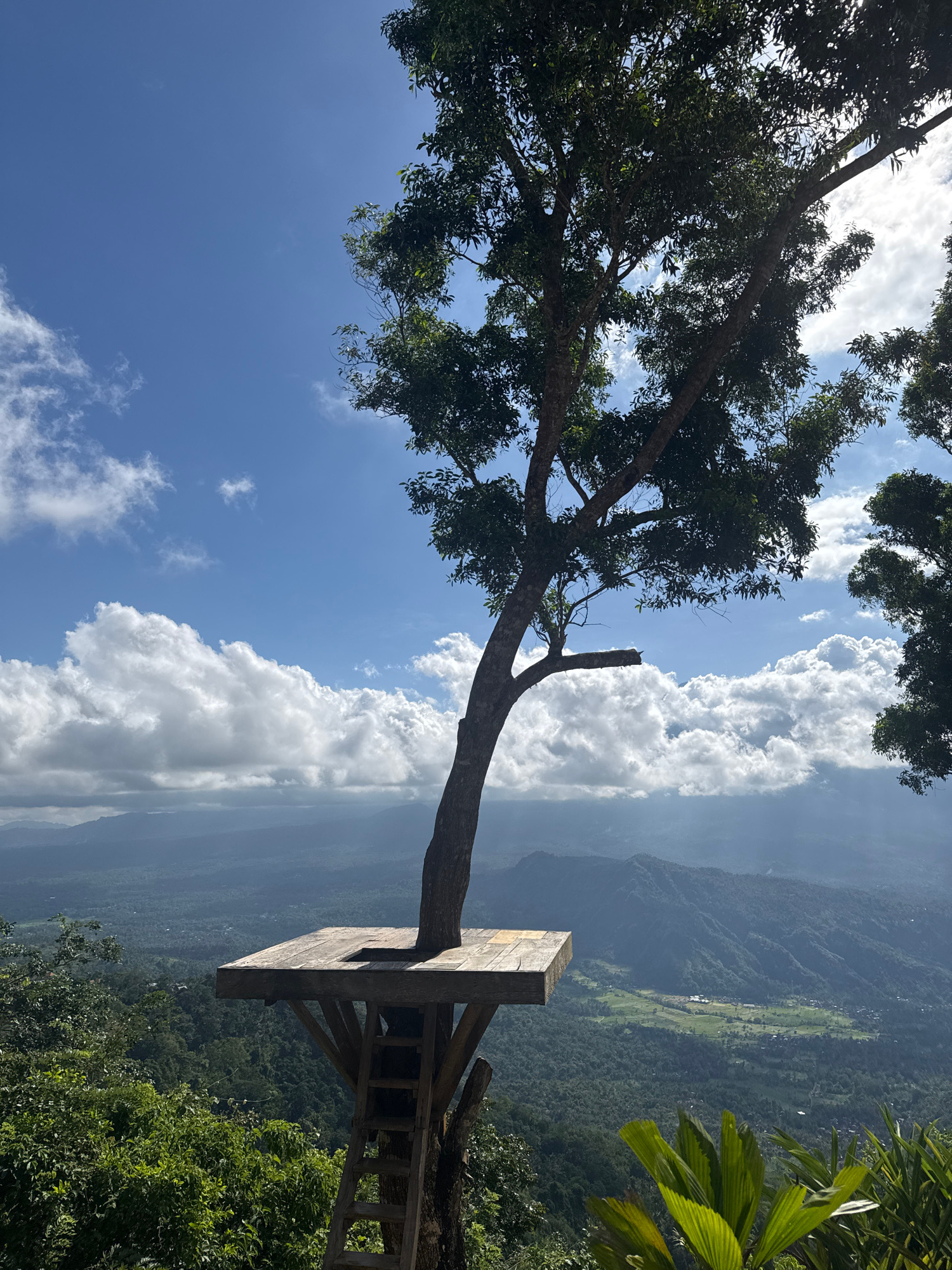 The image captures a scenic view from a high vantage point, dominated by a large tree with a constructed wooden platform. The photograph is taken on a bright, clear day, likely around mid-day, indicat…read more