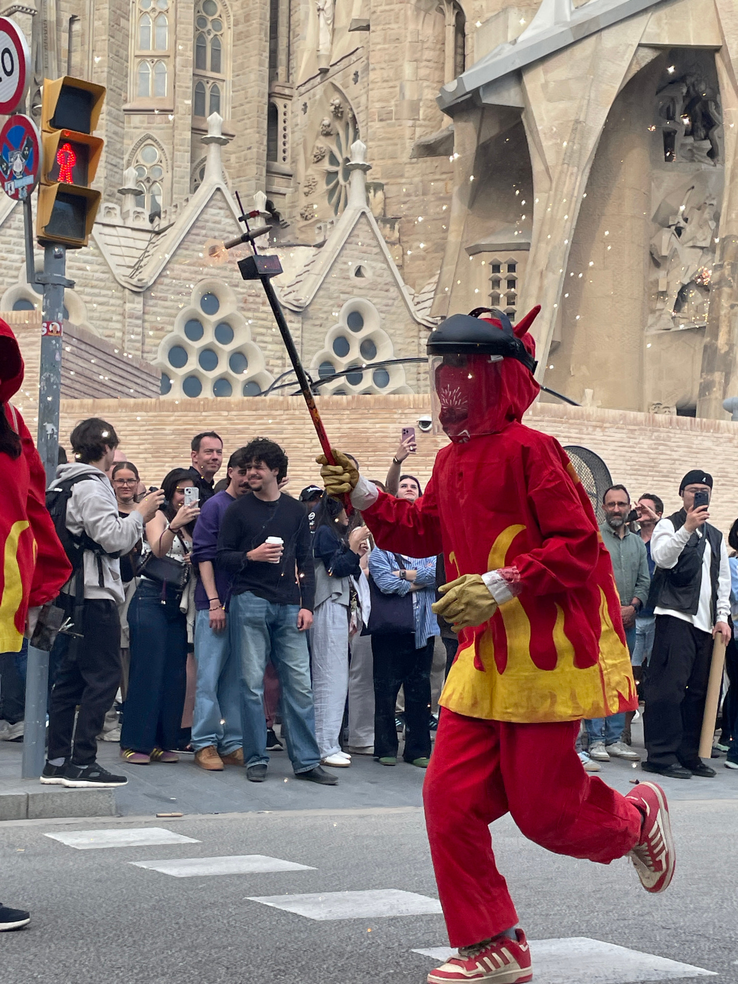 A person in a red devil costume with yellow flame embellishments is performing in front of a crowd. The individual is holding a pole with pyrotechnic devices attached, emanating sparks. Spectators are…read more