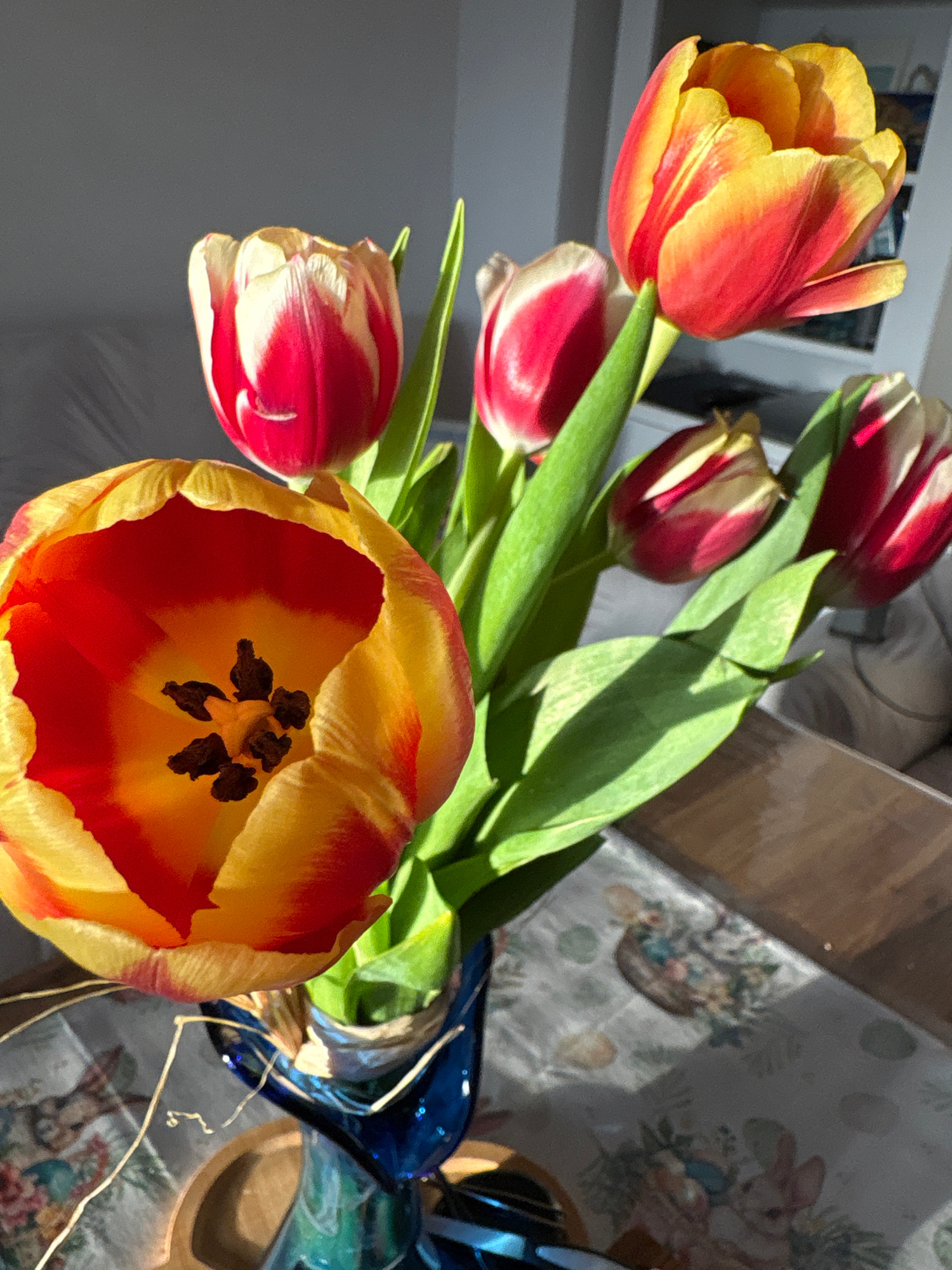 A close-up, high-angle shot shows a bouquet of six partially opened tulips in a blue vase. The tulips are predominantly red and white with yellow edges. One tulip is fully open, revealing a yellow int…read more