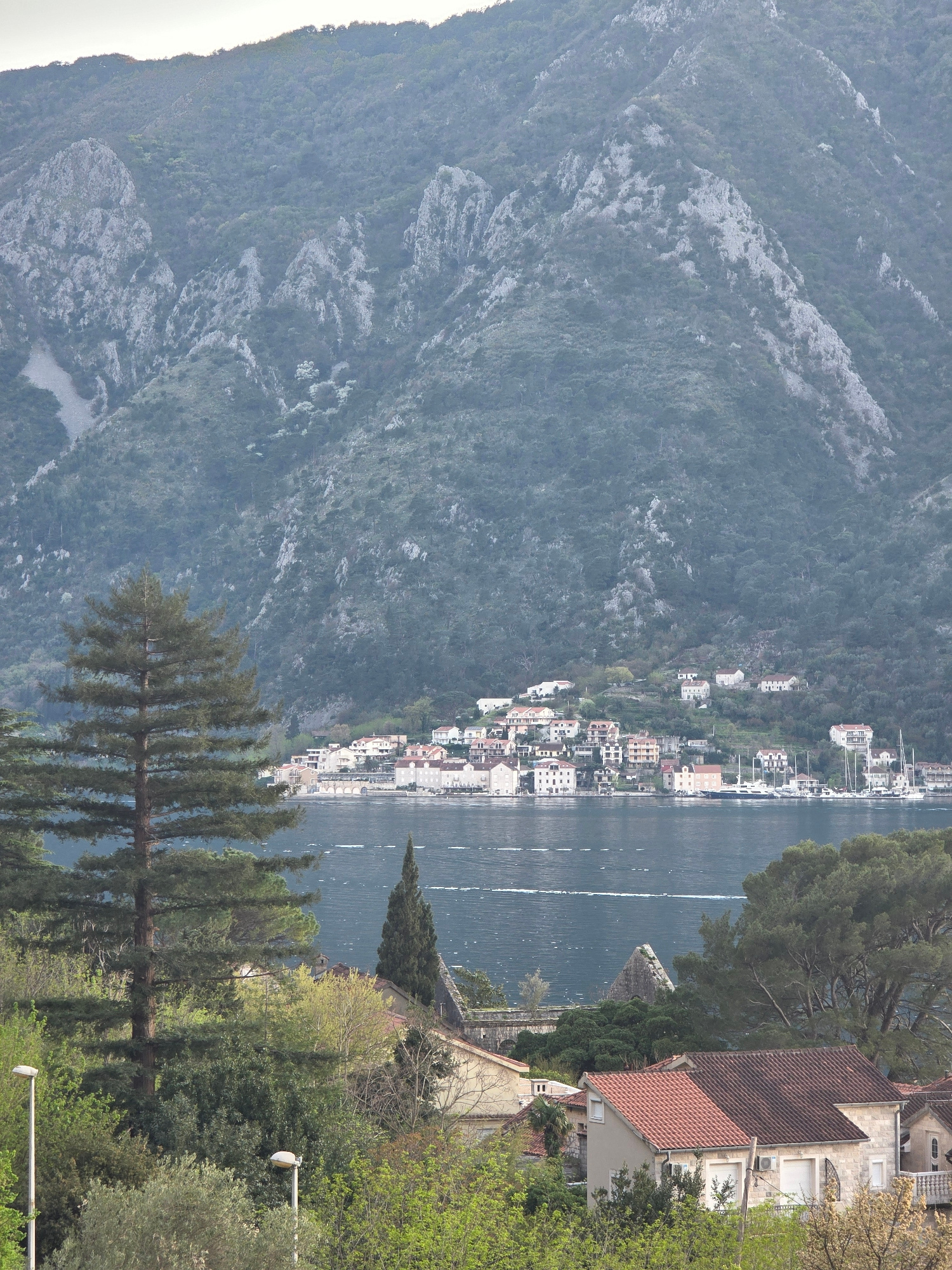 The image depicts a view of Dobrota, Montenegro, from an elevated perspective. The scene includes mountains on the left side, descending toward the coast. The sea or bay is visible, with a row of hous…read more