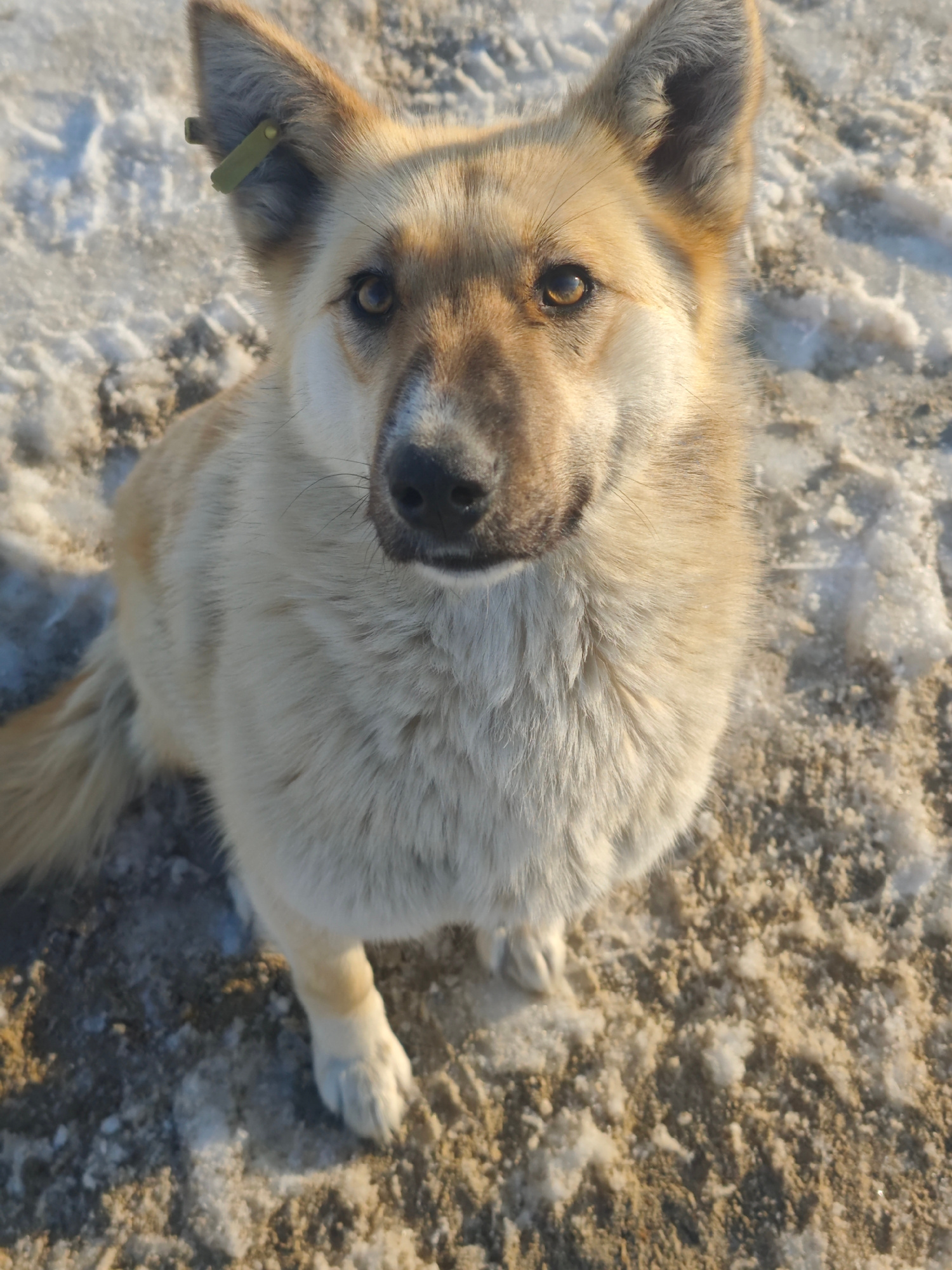 A medium-sized dog with light brown and tan fur sits on a surface covered with a mixture of snow and dirt, possibly in the city of Unknown, Russia. The dog has erect ears, one of which has a green tag…read more