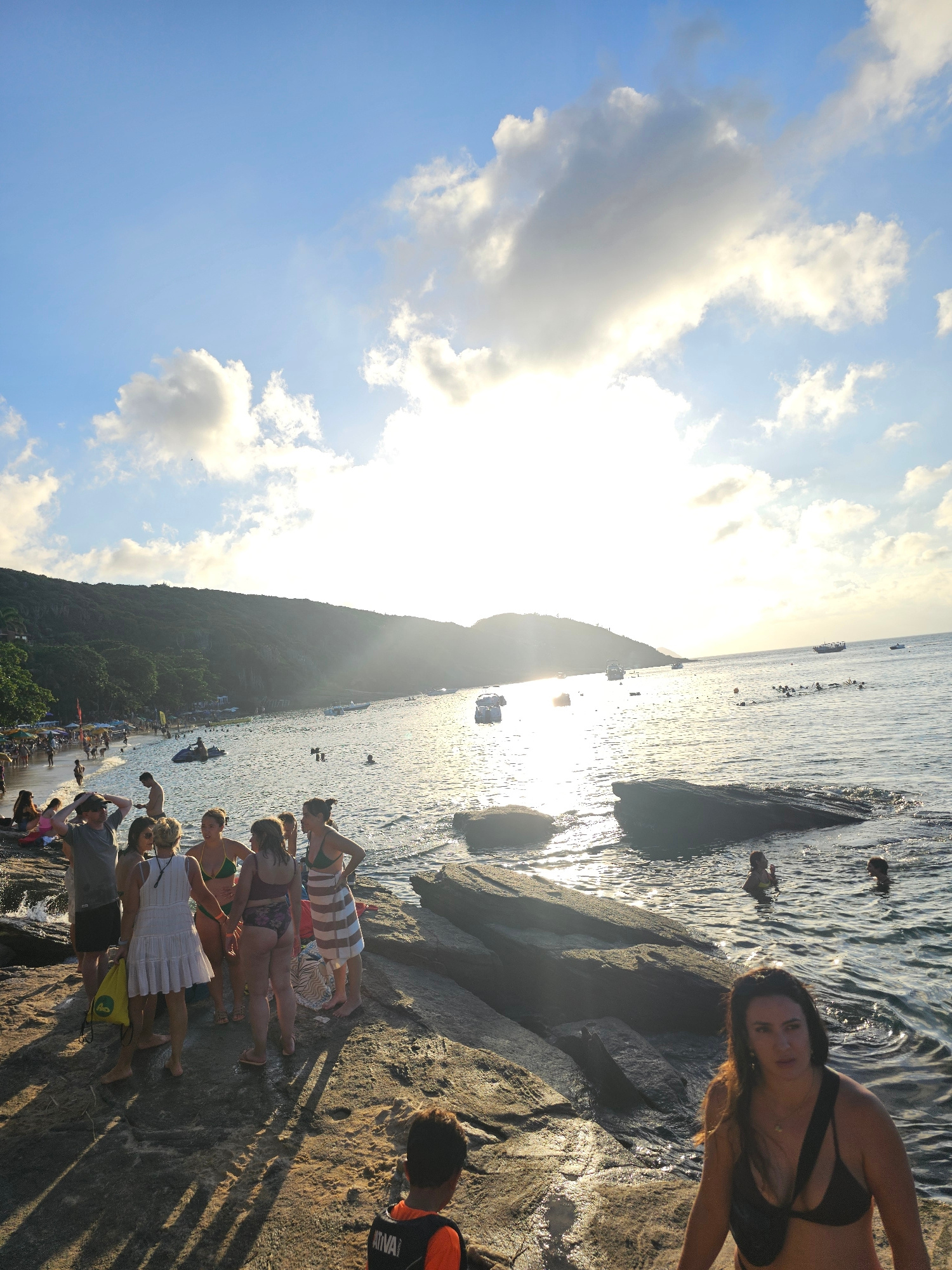 A slightly tilted image captures a sunny beach scene in Armação dos Búzios, Brazil. In the upper right corner, a woman in a dark bikini looks towards the camera from atop rocky terrain. To her left, t…read more