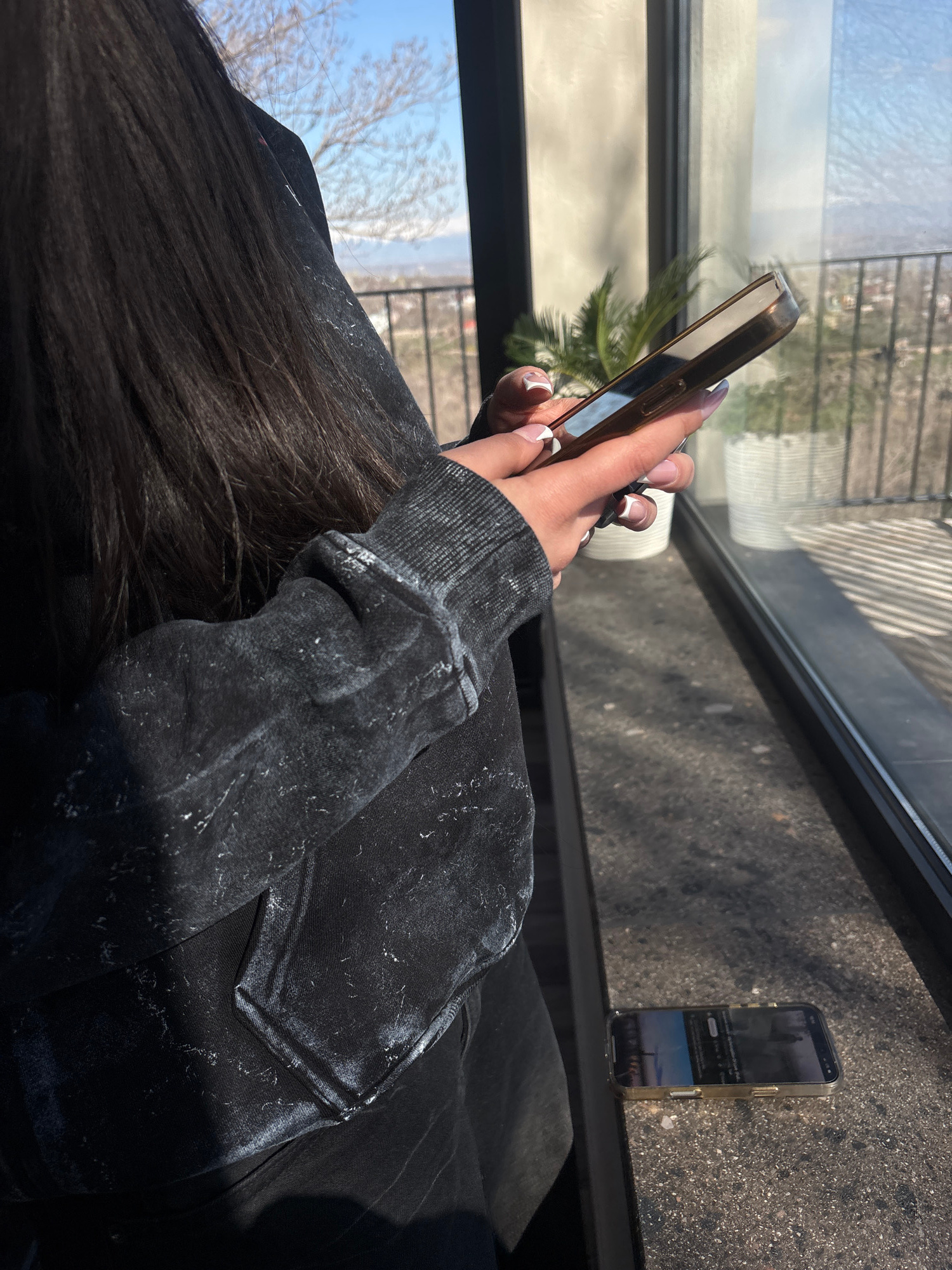The scene is set indoors, next to a large window, under bright natural sunlight in Orgov, Armenia. The dominant subject is a person, seen from a high angle, with long dark hair covering their back and…read more