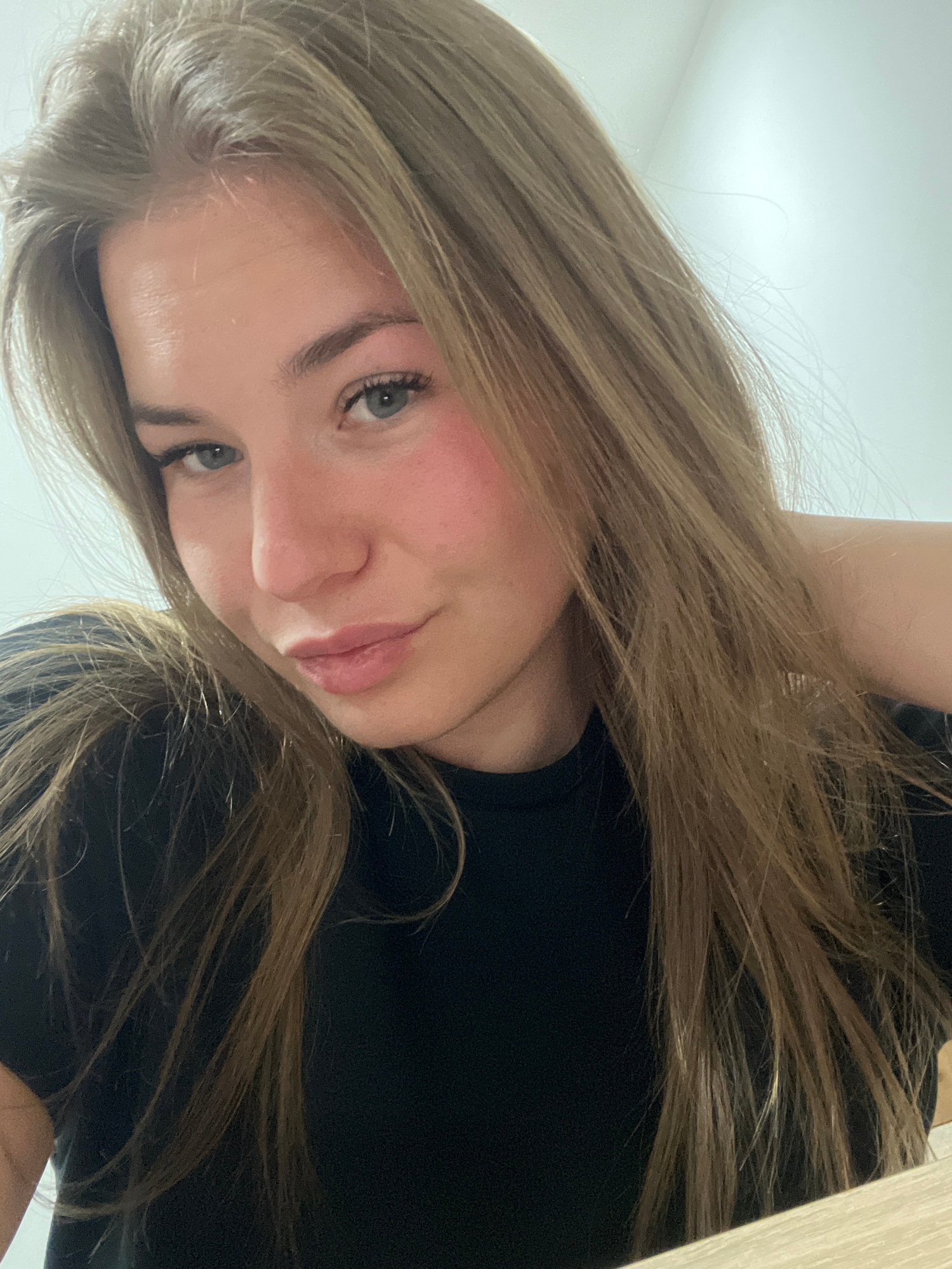 A close-up, selfie-style photograph shows a woman with light brown, long hair, wearing a black shirt. Her face is tilted towards the camera from an angle. She has fair skin, grey eyes, and light pink…read more