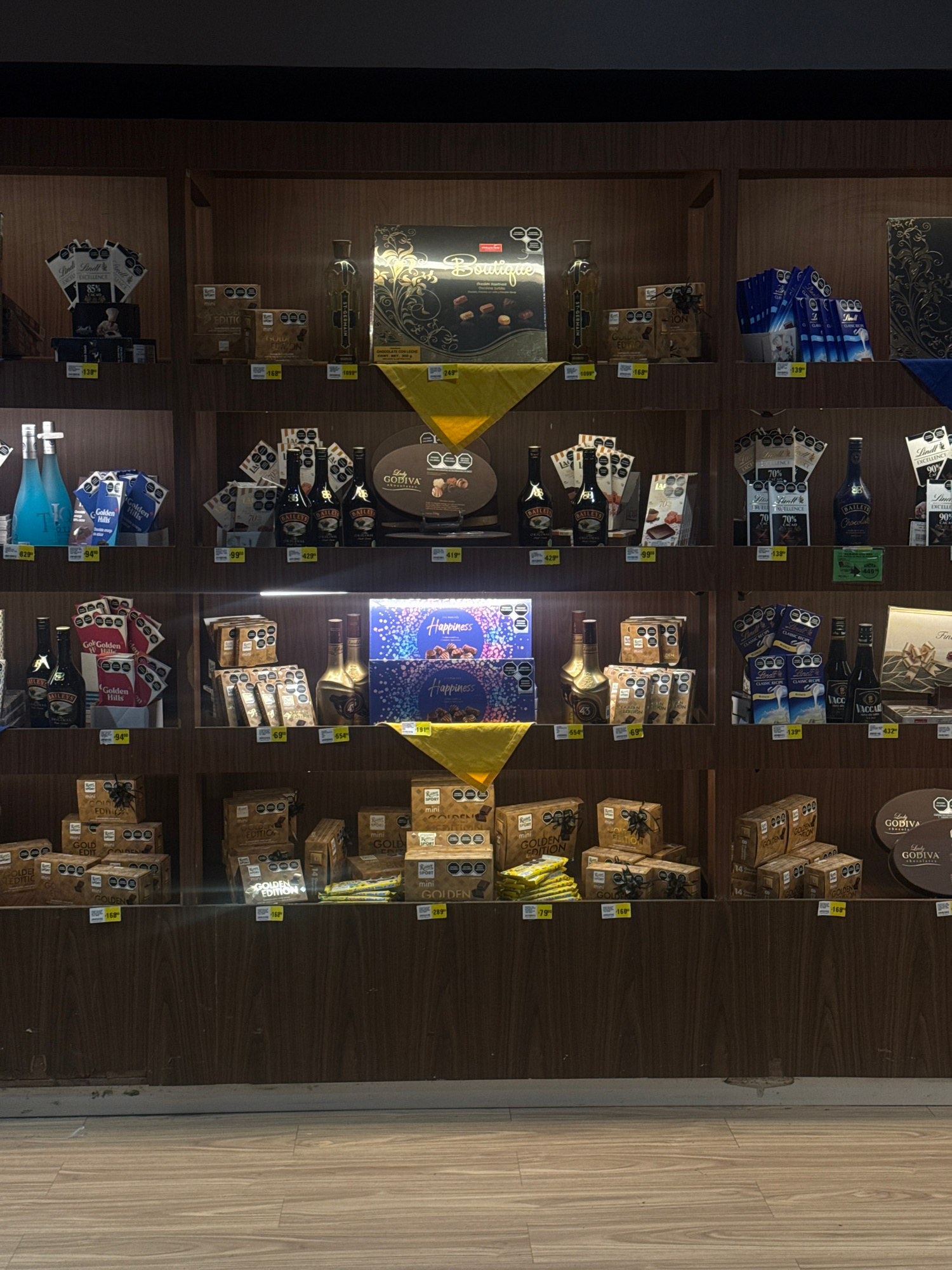 This is a photograph of items for sale in a store. The products are displayed on shelves made of a dark, wood-like material. The items include chocolates, candies, and bottles of alcoholic beverages s…read more