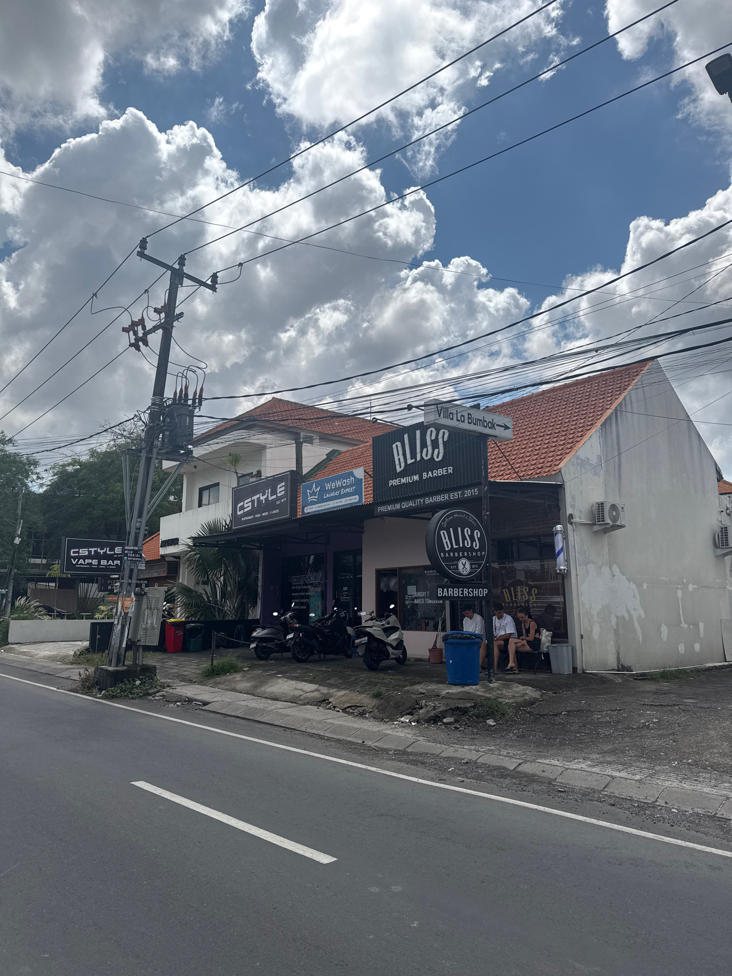 The image depicts a street view in North Kuta, Indonesia, featuring a series of commercial establishments. On the right side of the street, there's a business labeled "Bliss Barbershop," with a barber…read more