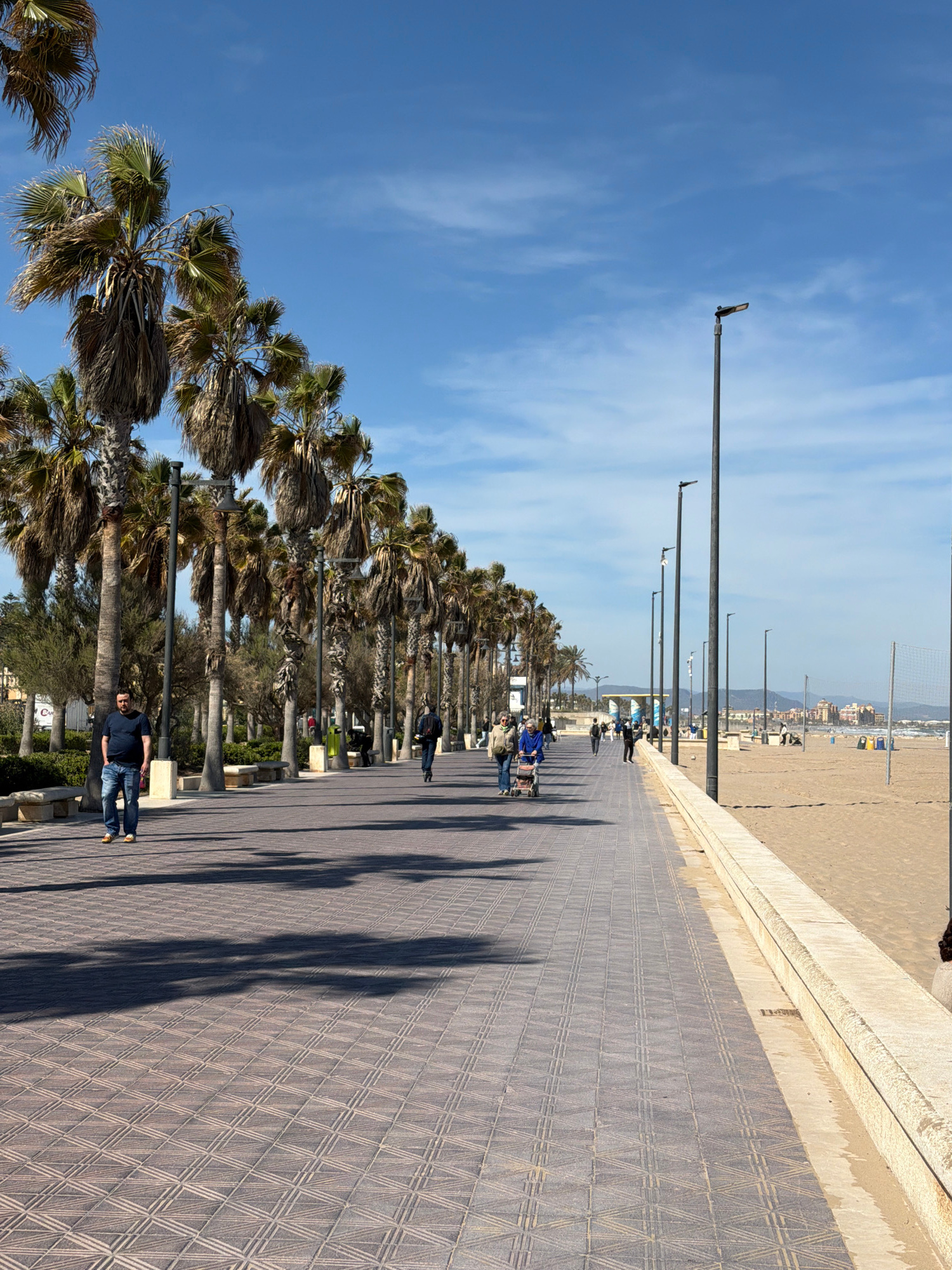 This image depicts a wide, tiled promenade running parallel to a sandy beach under a clear blue sky with scattered clouds, characteristic of a coastal area in Valencia, Spain. A long, dense row of mat…read more