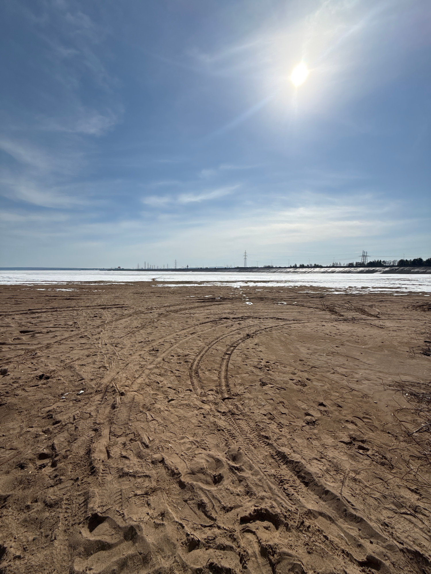 The image depicts a horizontal division of contrasting landscapes. The left side showcases a bright sky with light clouds and the sun. The right side features a sandy or earthen ground covered in trac…read more