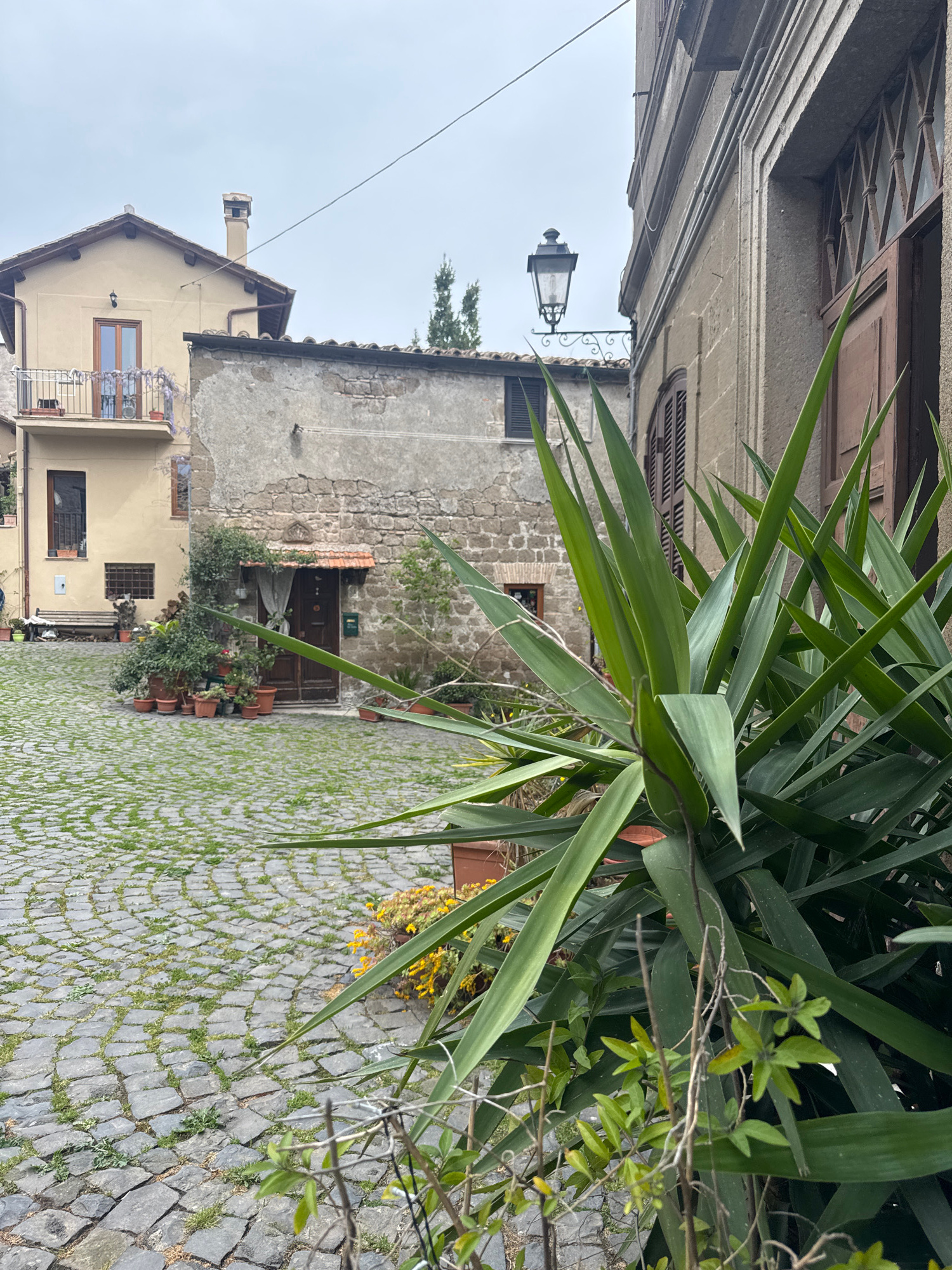 The image shows a street in Castelnuovo di Porto, Italy. The foreground is dominated by a large yucca plant in a terracotta pot, partially obscuring the view. The street is paved with cobblestones wit…read more