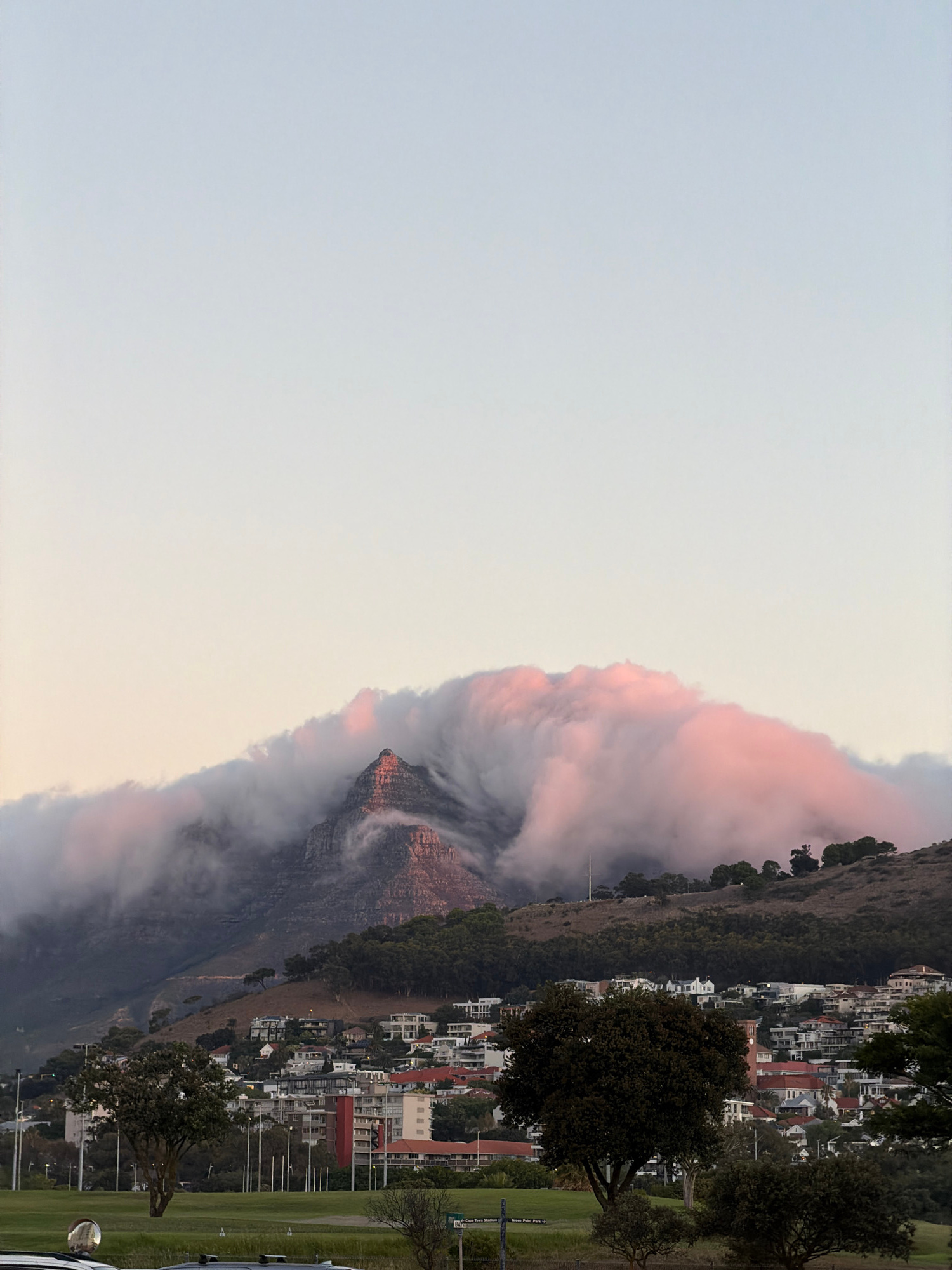 The image shows Lion's Head mountain in Cape Town, South Africa. A thick blanket of clouds is draped over the mountain. In the background, there are buildings and trees. The sky is a pale grey. | Open Wire