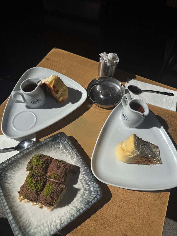 The scene captures a high-angle view of a wooden cafe table under direct sunlight, casting strong shadows and leaving a dark, indistinct background. Three dessert plates are arranged on the table. The…read more
