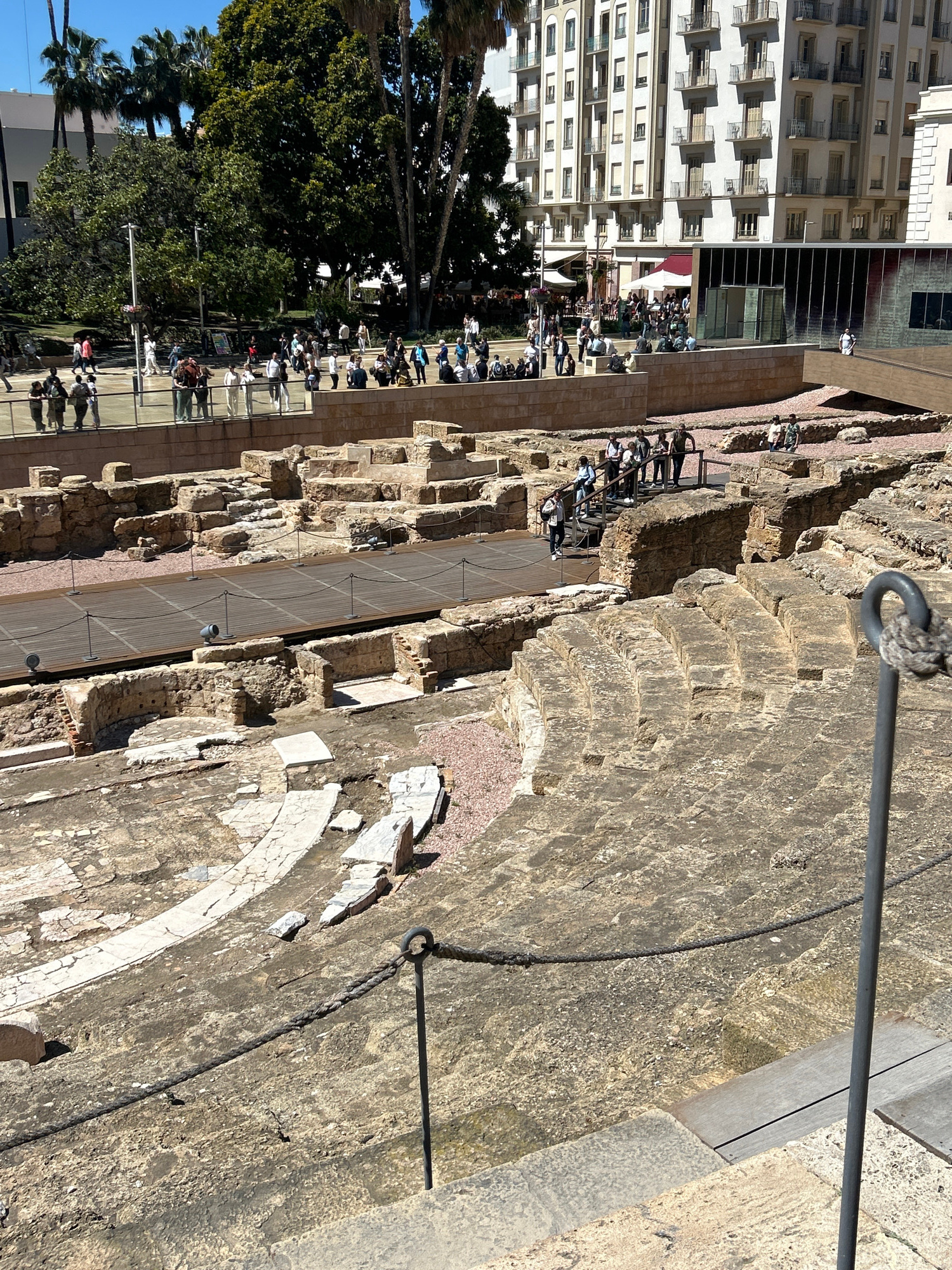 This photograph depicts the Roman Theatre of Málaga, Spain. The ruins of the theater are in the foreground, consisting of tiered stone seating areas with a pedestrian walkway running through the cente…read more