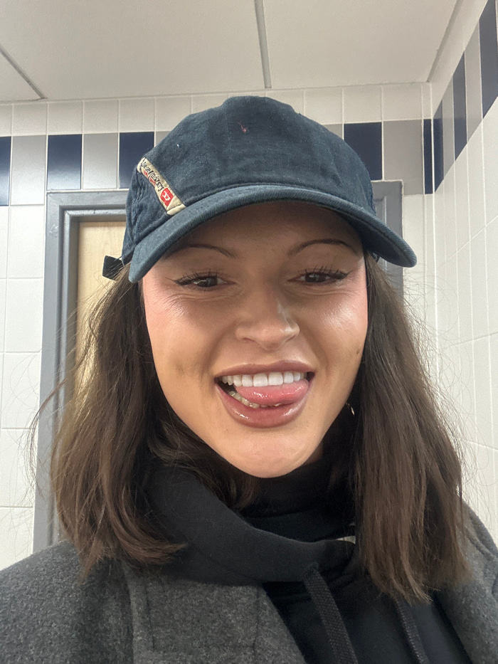 A woman smiles, showcasing her teeth. She wears a dark-colored cap with a visible brand label. She is dressed in a black hoodie and a gray coat. Her hair is shoulder-length and brown. The background f…read more