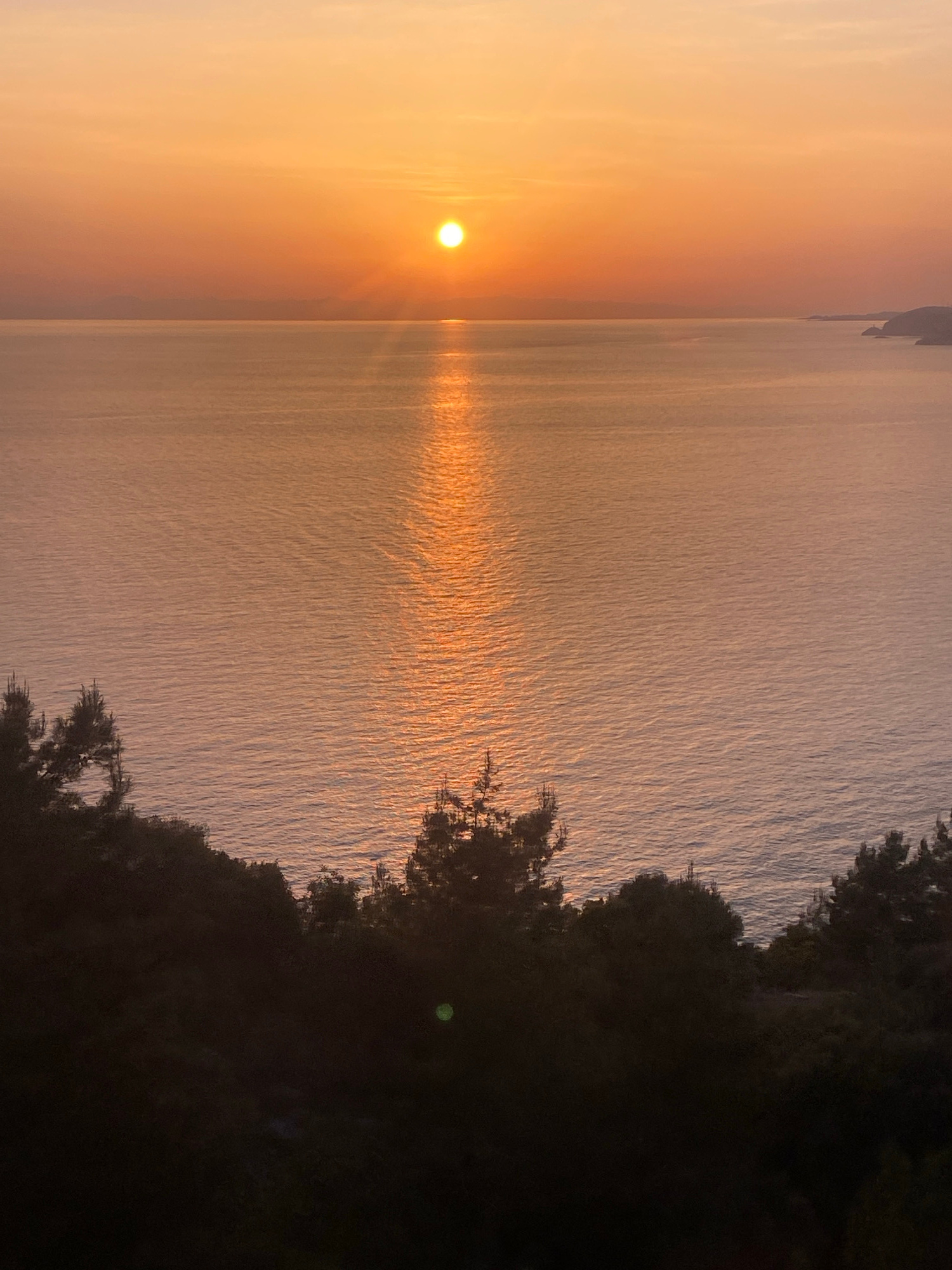 The image depicts a sunset over a body of water, likely the Mediterranean Sea, observed from a vantage point along the coast of Alanya, Turkey. A bright, golden sun is positioned near the horizon on t…read more