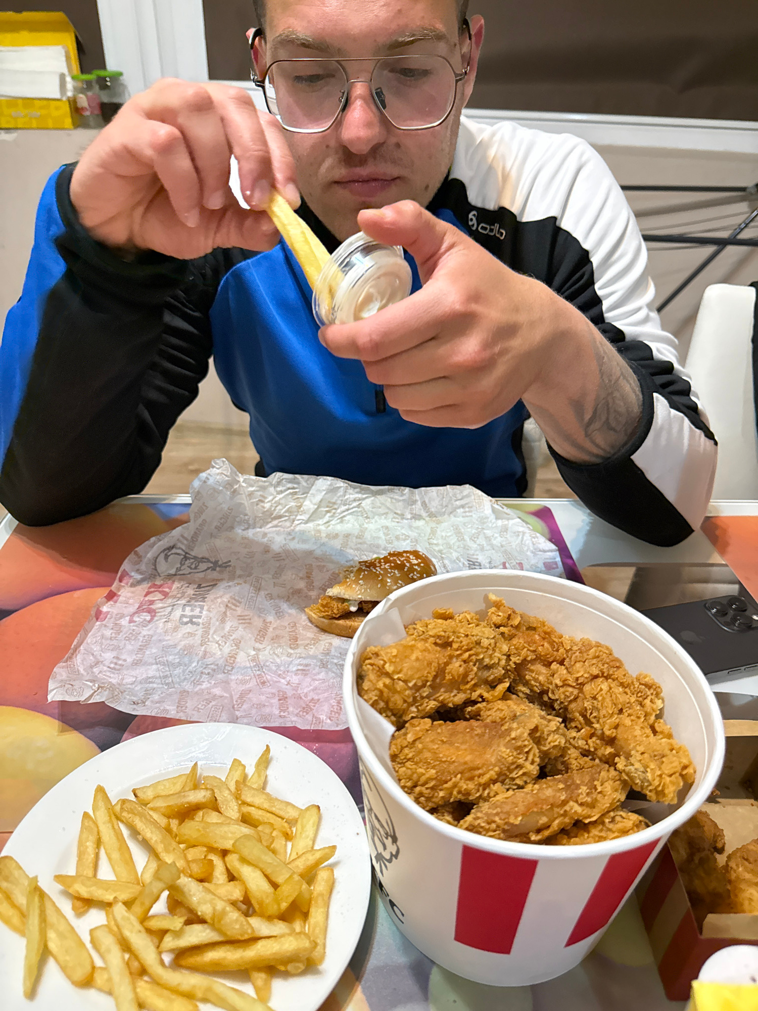 A man wearing glasses and a blue and black jacket is shown in an indoor setting, pouring sauce on a french fry. A bucket of fried chicken, a plate of french fries, and a sandwich in KFC paper wrapping…read more