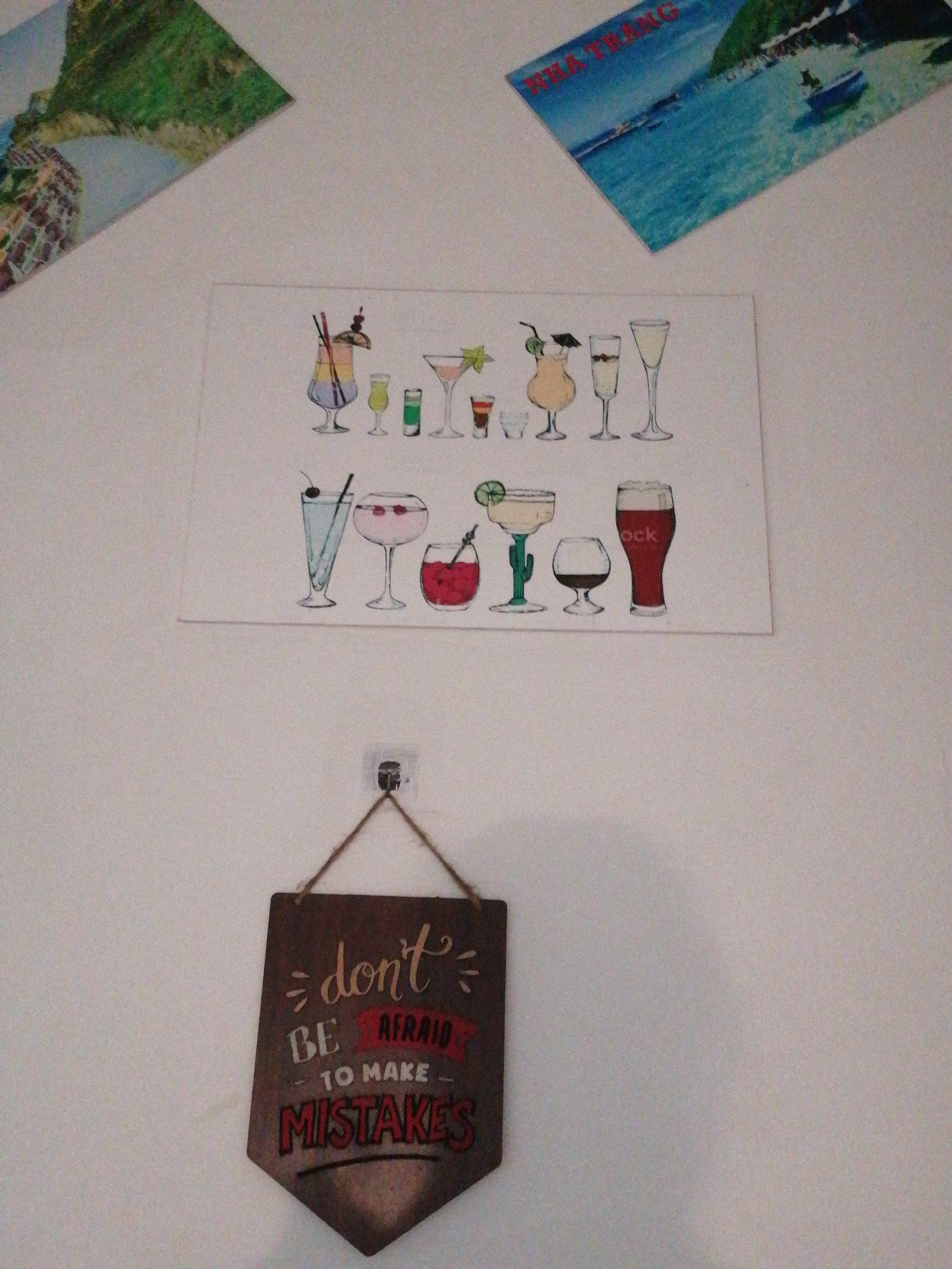 The image captures a section of a light-colored wall, possibly white or off-white, adorned with various decorations. At the top left, a diagonal print or postcard displays a verdant green landscape, p…read more