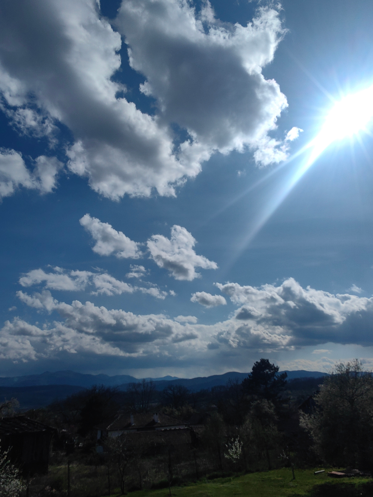 The image captures a sunny day scene in Hirevo, Bulgaria. The sky is predominantly blue with scattered white cumulus clouds. The sun is positioned in the upper right corner of the frame, emitting a br…read more