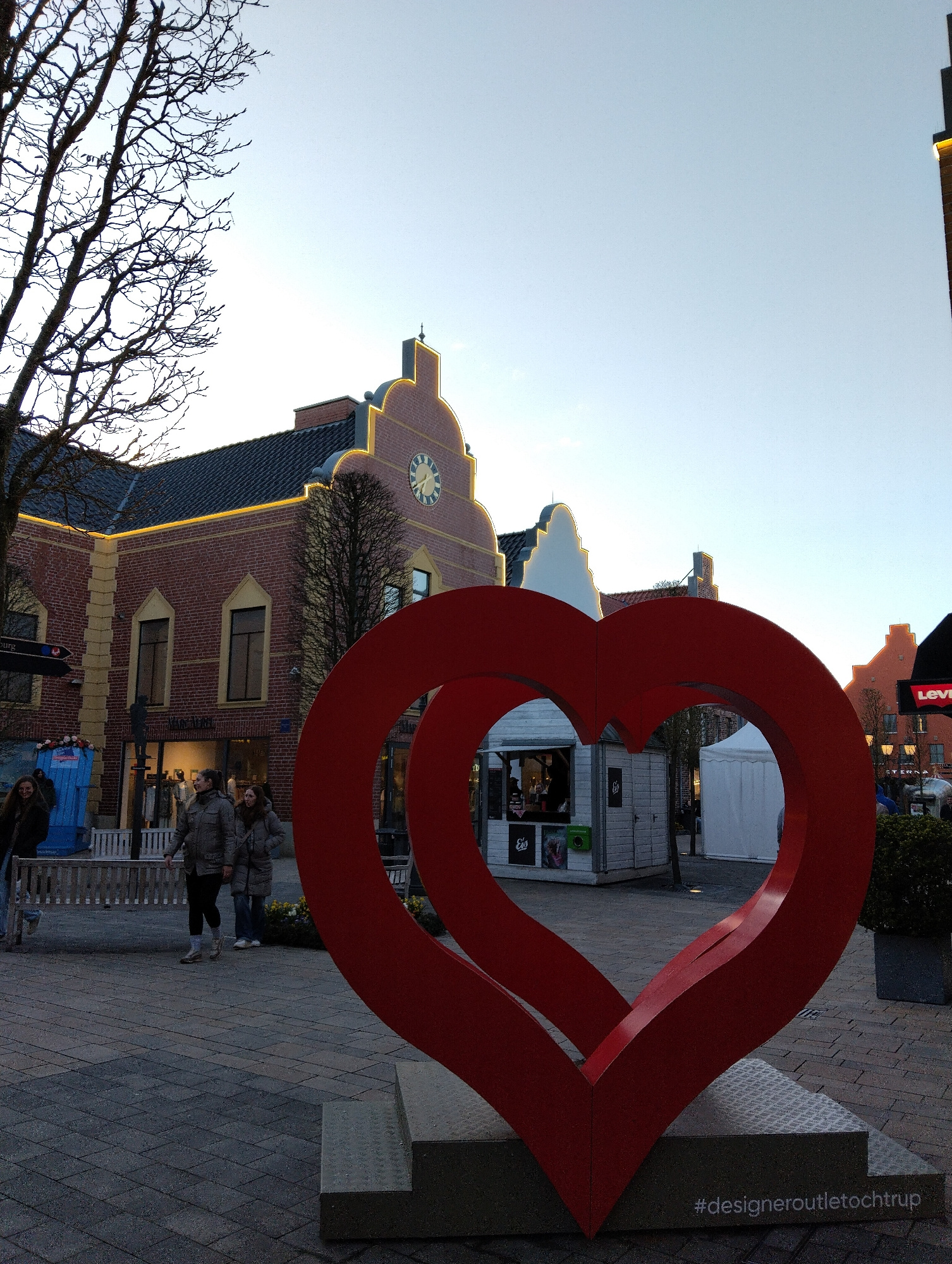 The image captures a scene in Ochtrup, Germany, at the Designer Outlet Ochtrup. In the foreground, a large, red, double-heart sculpture stands on a grey, tiered base. A hashtag "#designeroutletochtrup…read more