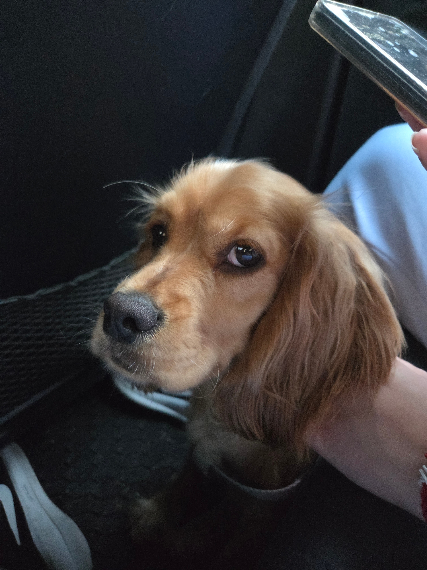 A close-up shot of a golden-brown cocker spaniel-type dog, likely taken indoors, potentially in a car. The dog's head is tilted, looking at the camera with a slightly sad expression. Part of a person'…read more
