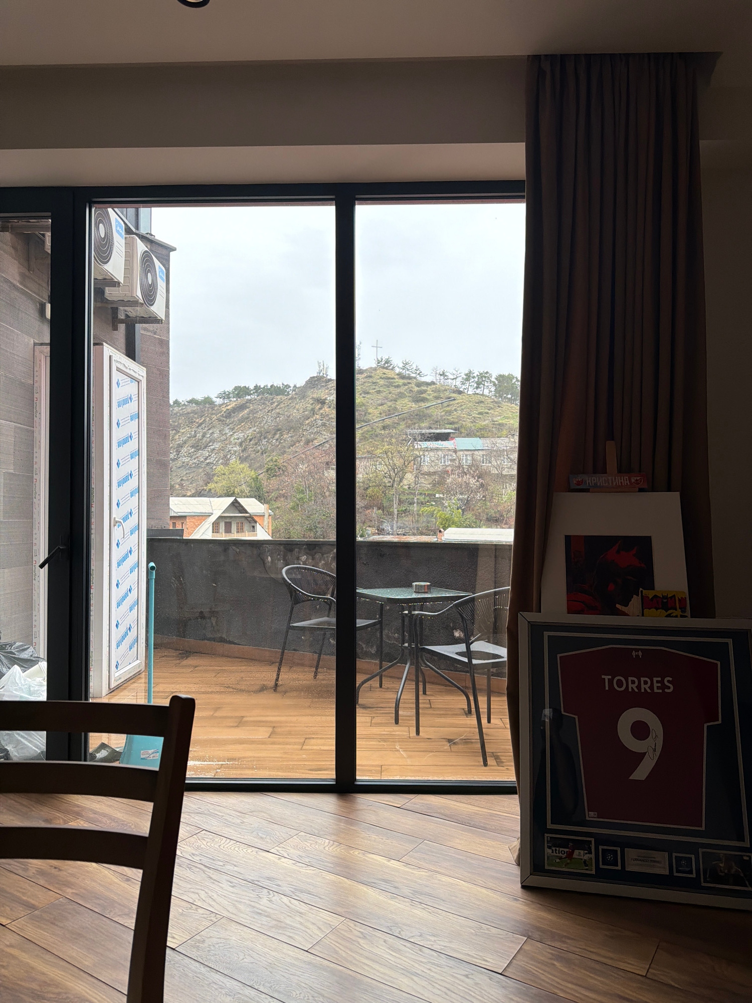 The image displays an interior view looking outwards through large, multi-pane glass doors onto an outdoor balcony and a distant hillside under an overcast sky. The location is Tbilisi, Georgia, speci…read more
