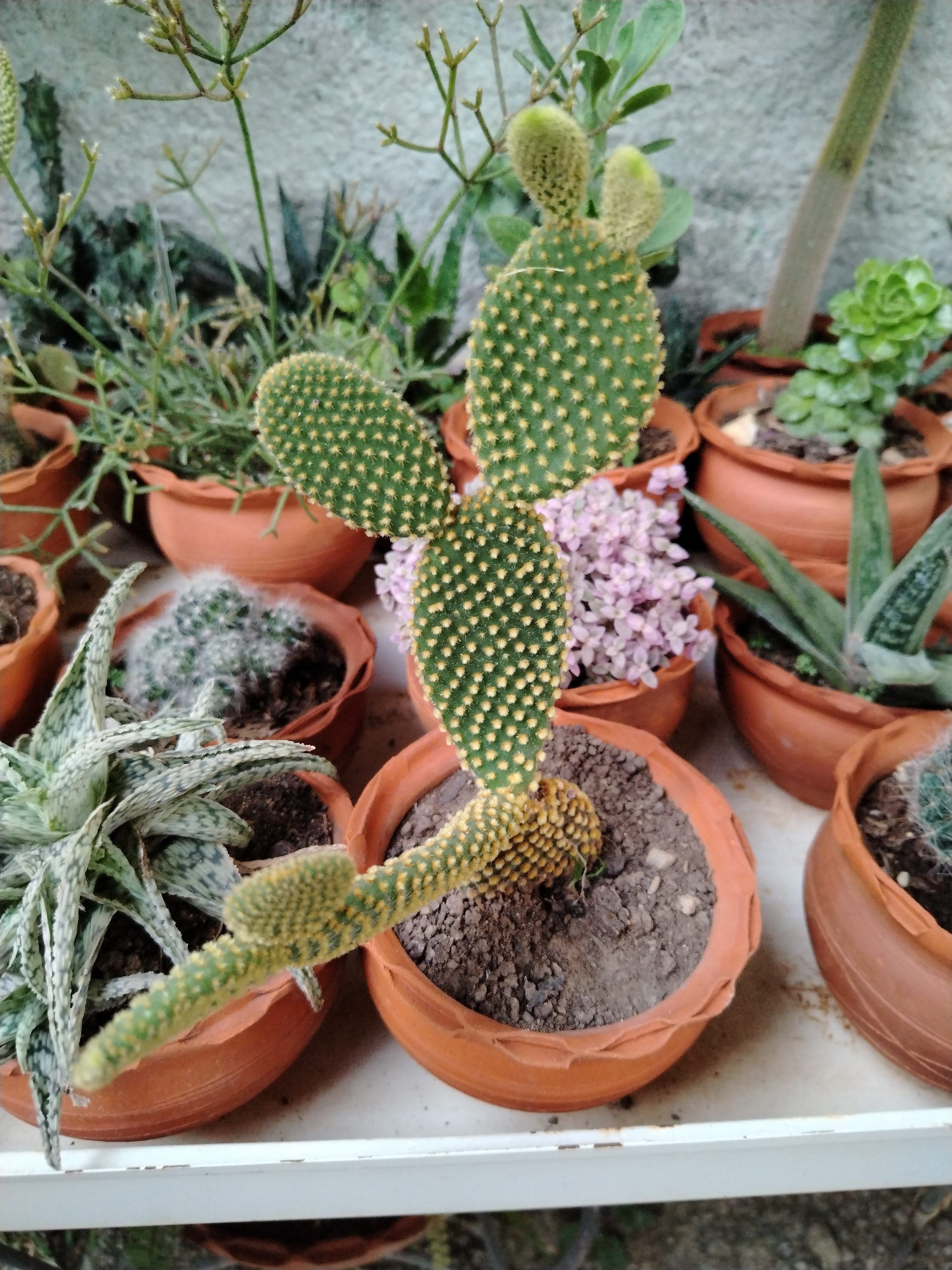 A medium shot displays a variety of small potted succulents and cacti. The primary subject is a cactus with rounded pads covered in yellow spines, planted in a terracotta pot. It is surrounded by othe…read more