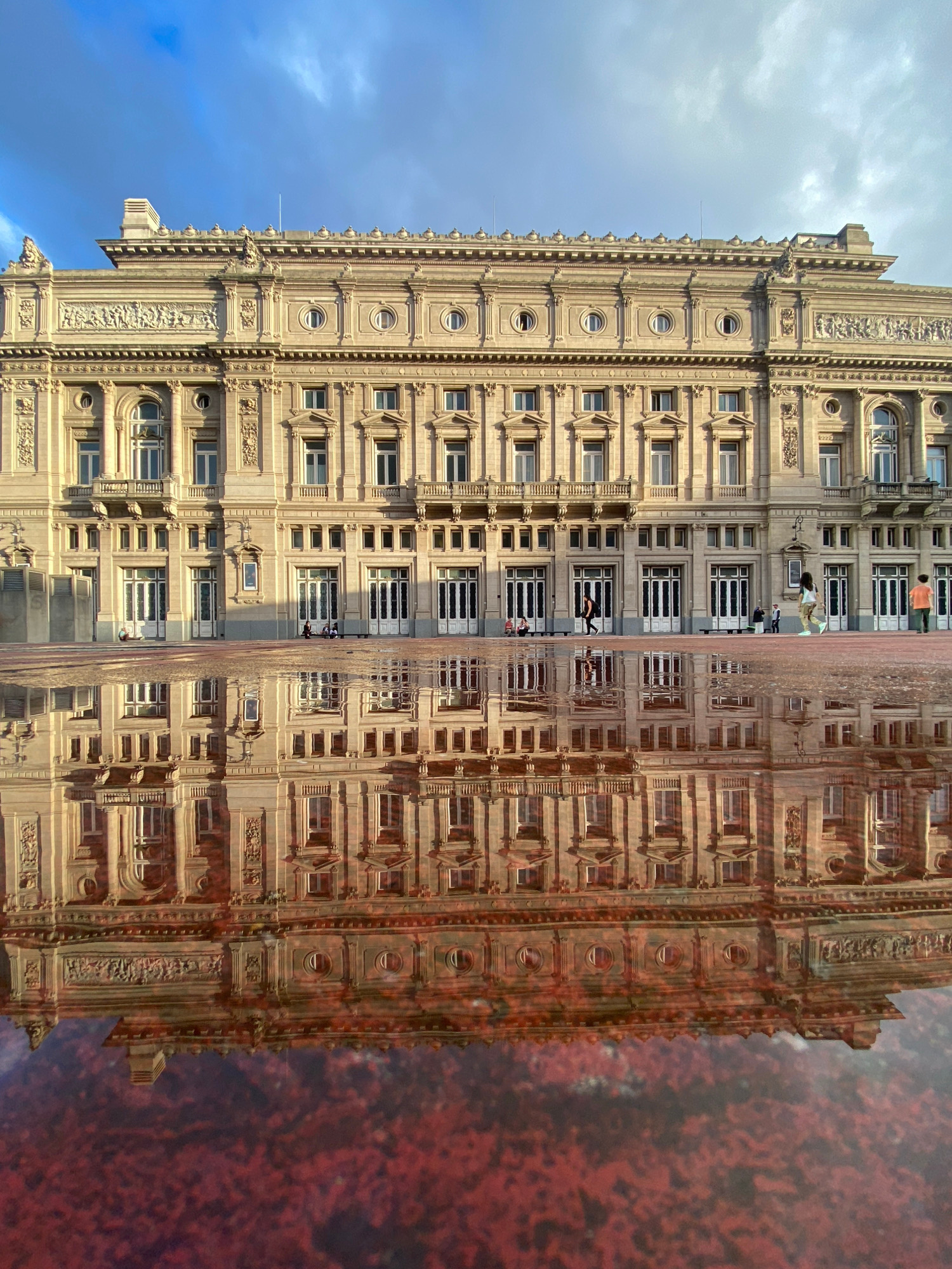 The image displays a grand, ornate building captured alongside its vibrant reflection. The building, likely situated in Buenos Aires, Argentina, appears to be made of light-colored stone or concrete,…read more