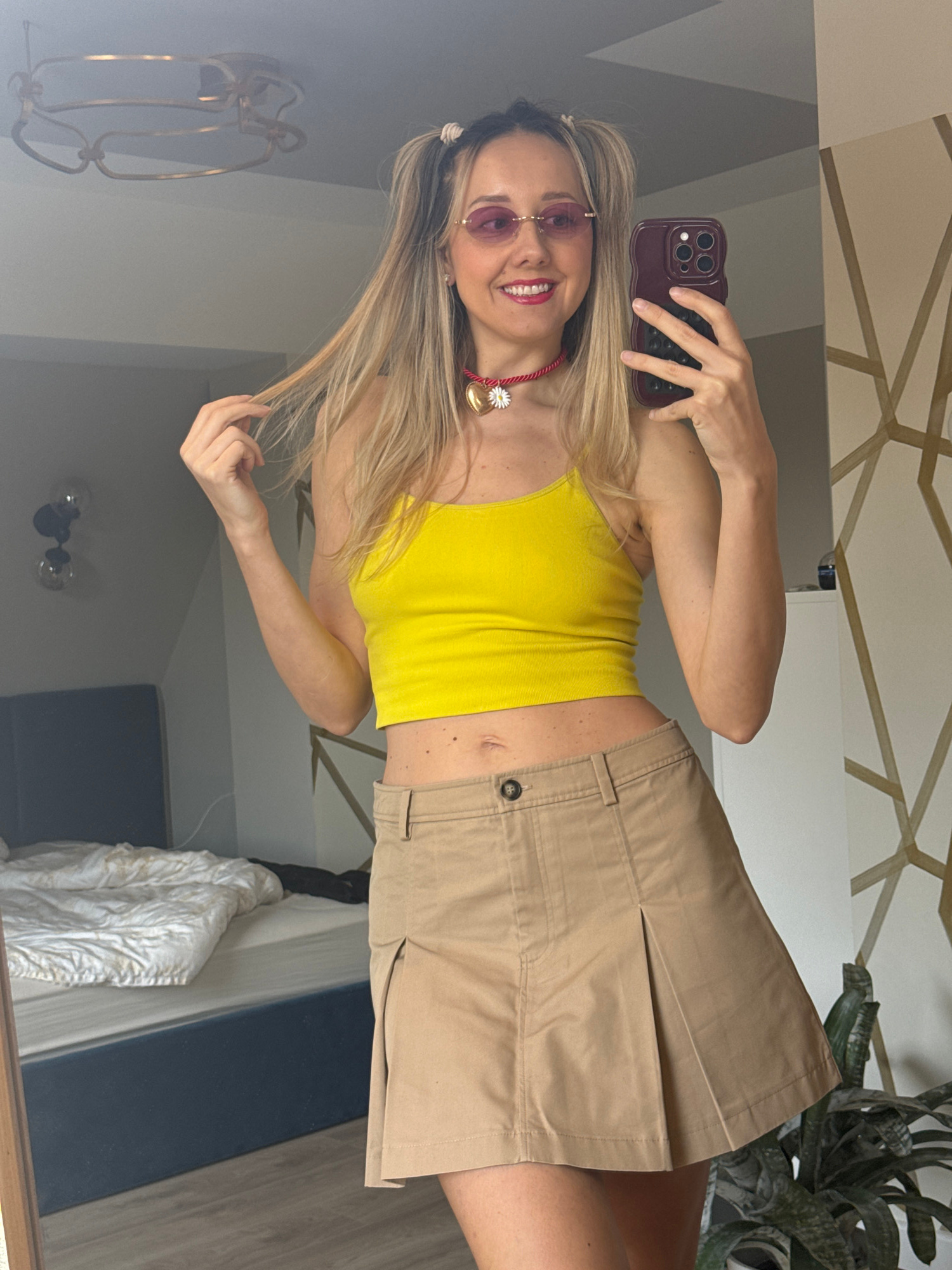 A woman stands indoors, taking a selfie in a mirror. She is wearing pink-tinted sunglasses, a yellow crop top, and tan shorts. She has blonde hair pulled back with a small hair tie on each side. She i…read more