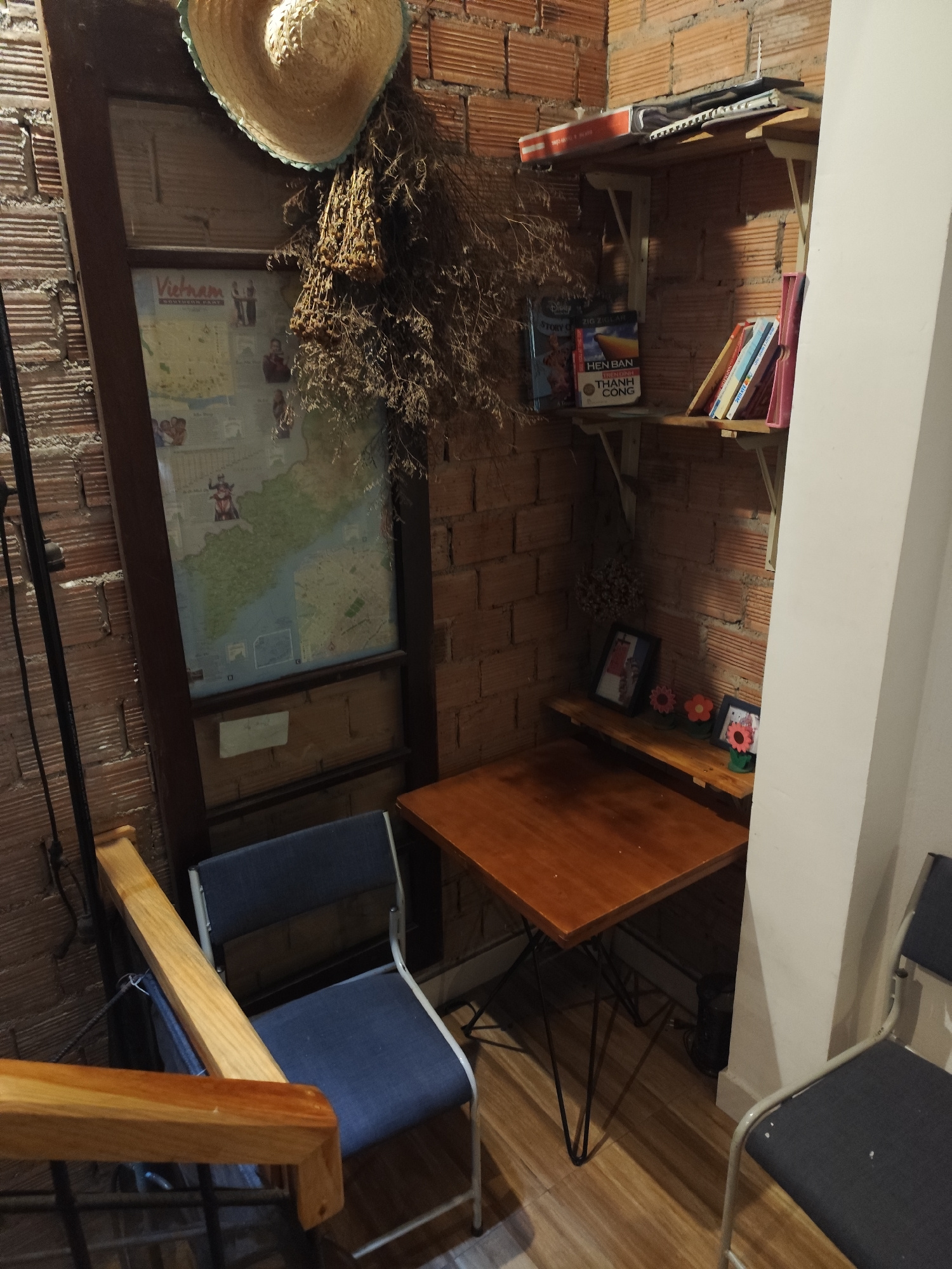 Indoor scene in Da Lat, Vietnam. Brick wall corner features a straw hat atop a framed map of Vietnam, accompanied by dried floral arrangements. Two wooden shelves hold books and picture frames. A smal…read more