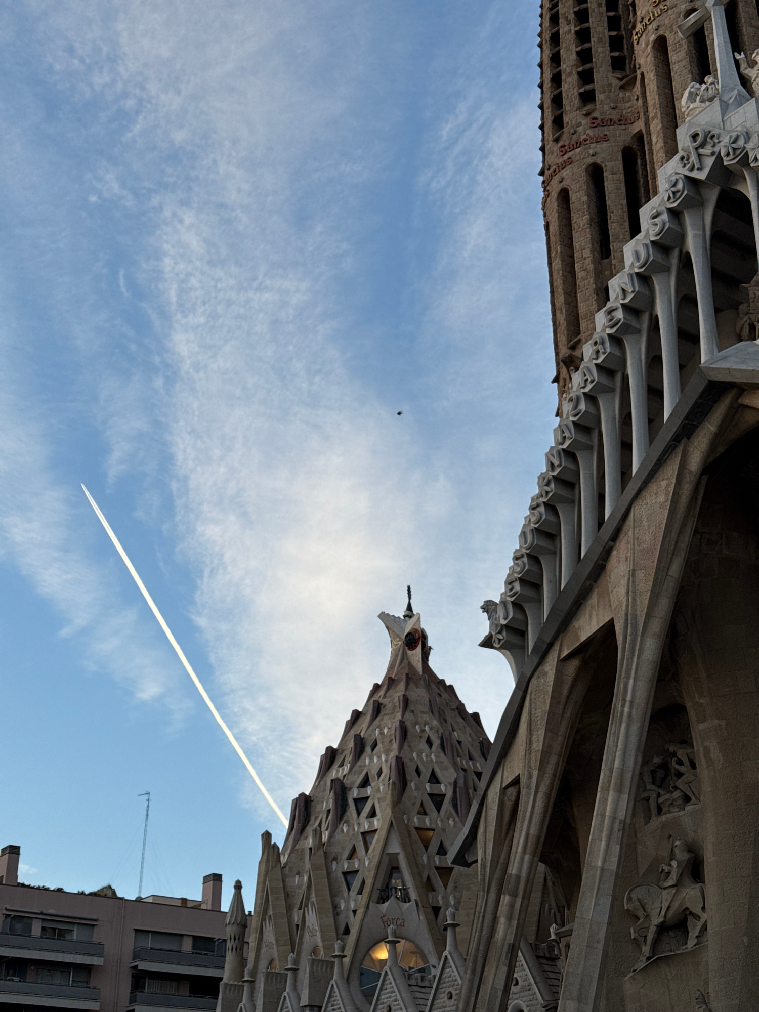 An upward-angled view captures elements of the Sagrada Família basilica in Barcelona, Spain. The primary subjects are a portion of the Passion Façade and one of its bell towers, set against a blue sky…read more