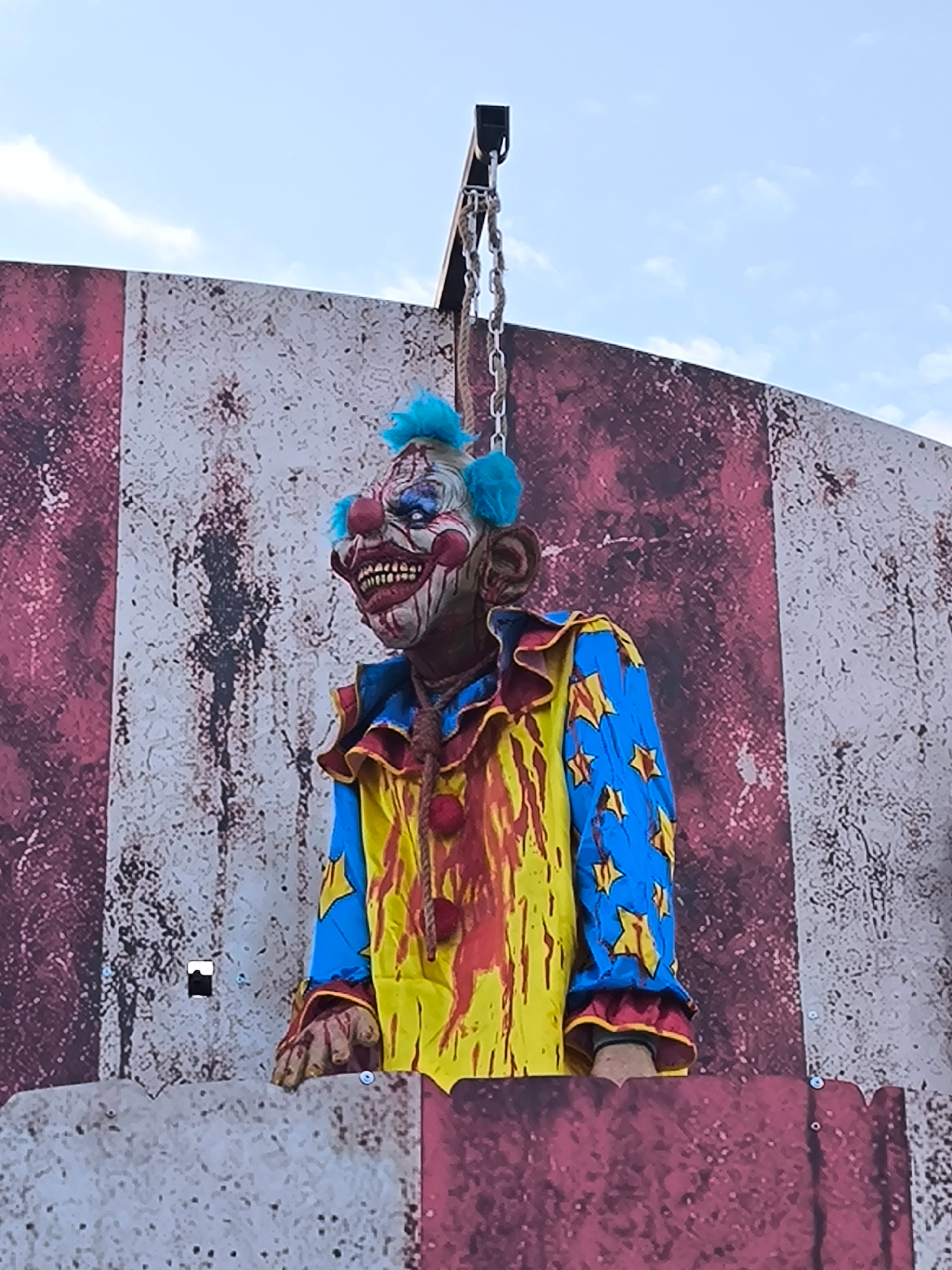 A gruesome clown prop is suspended by a chain in Riga, Latvia. The clown has blue hair, painted red circles on its cheeks, and a sinister grin exposing sharp teeth. It wears a yellow and blue clown su…read more