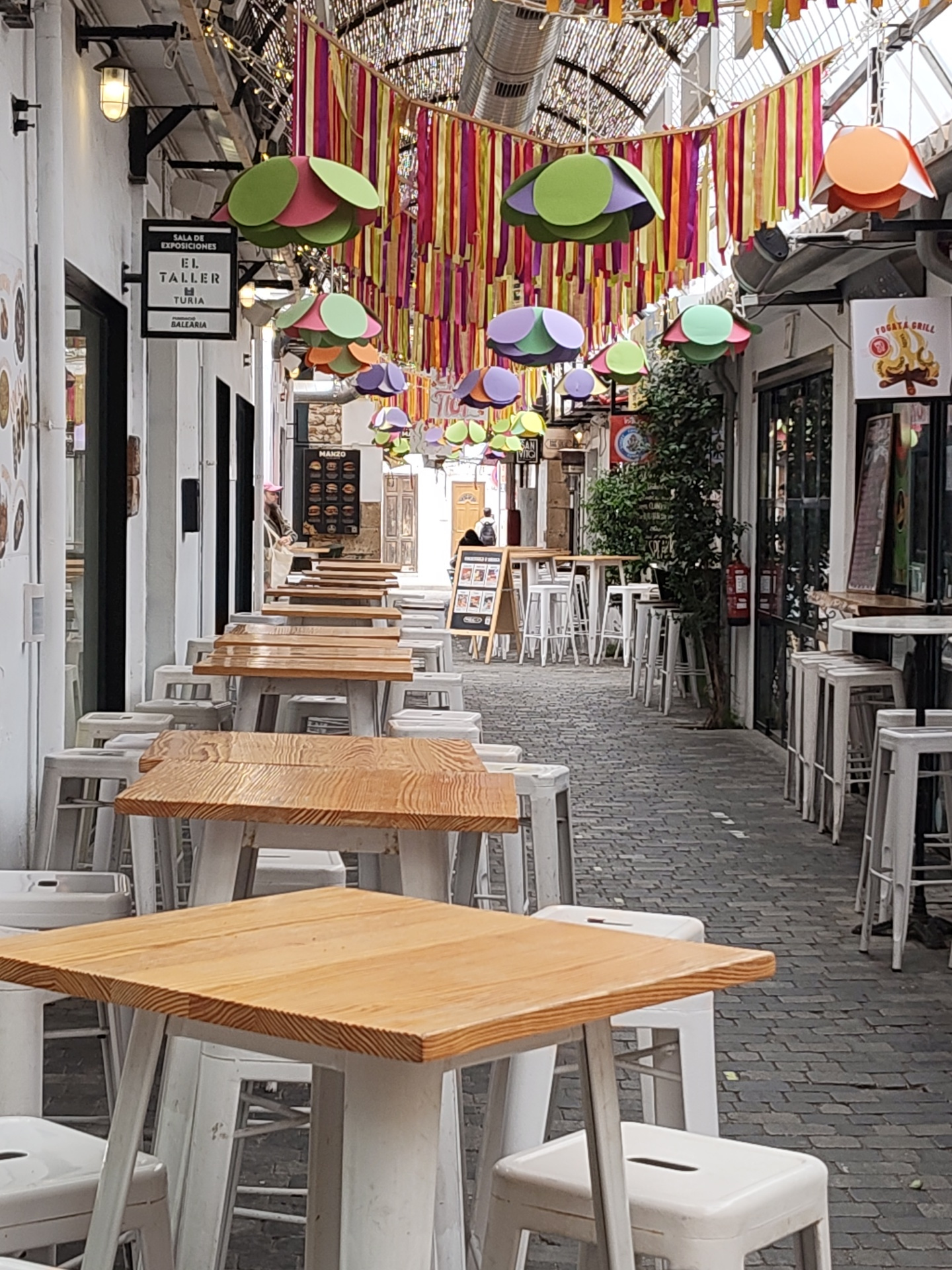 The image depicts a narrow pedestrian street in Dénia, Spain, lined with restaurants or cafes. The street is paved with gray bricks. Several rows of tables and white stools extend along the length of…read more