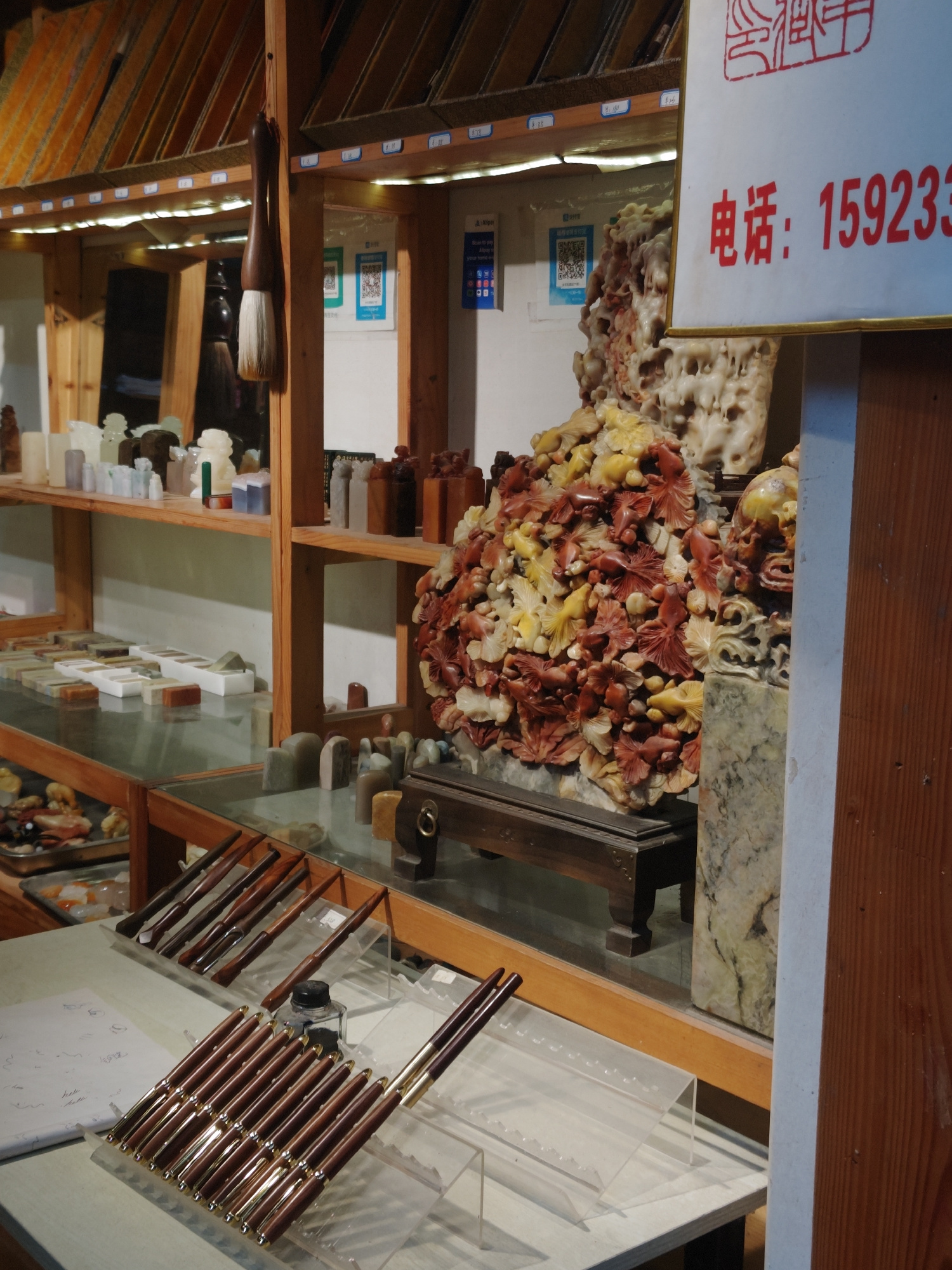 The image shows a shop display in Shapingba District, China. A glass-topped display case contains pens and small carved items. Shelves behind the display case contain various stone carvings and brushe…read more