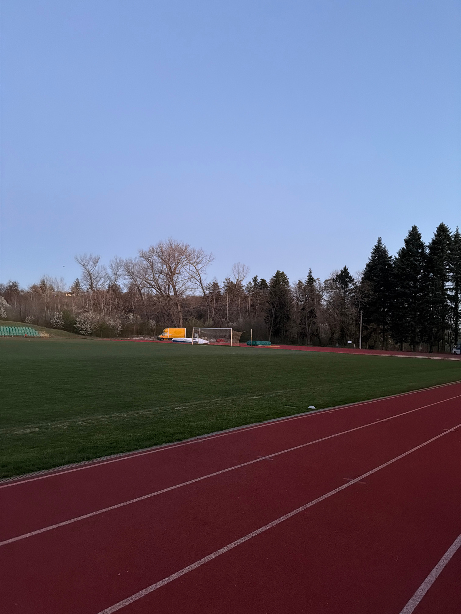The image depicts a track and field area adjacent to a soccer field, with a running track on the right, green turf in the middle, and a backdrop of trees on the left. In the background is a soccer goa…read more