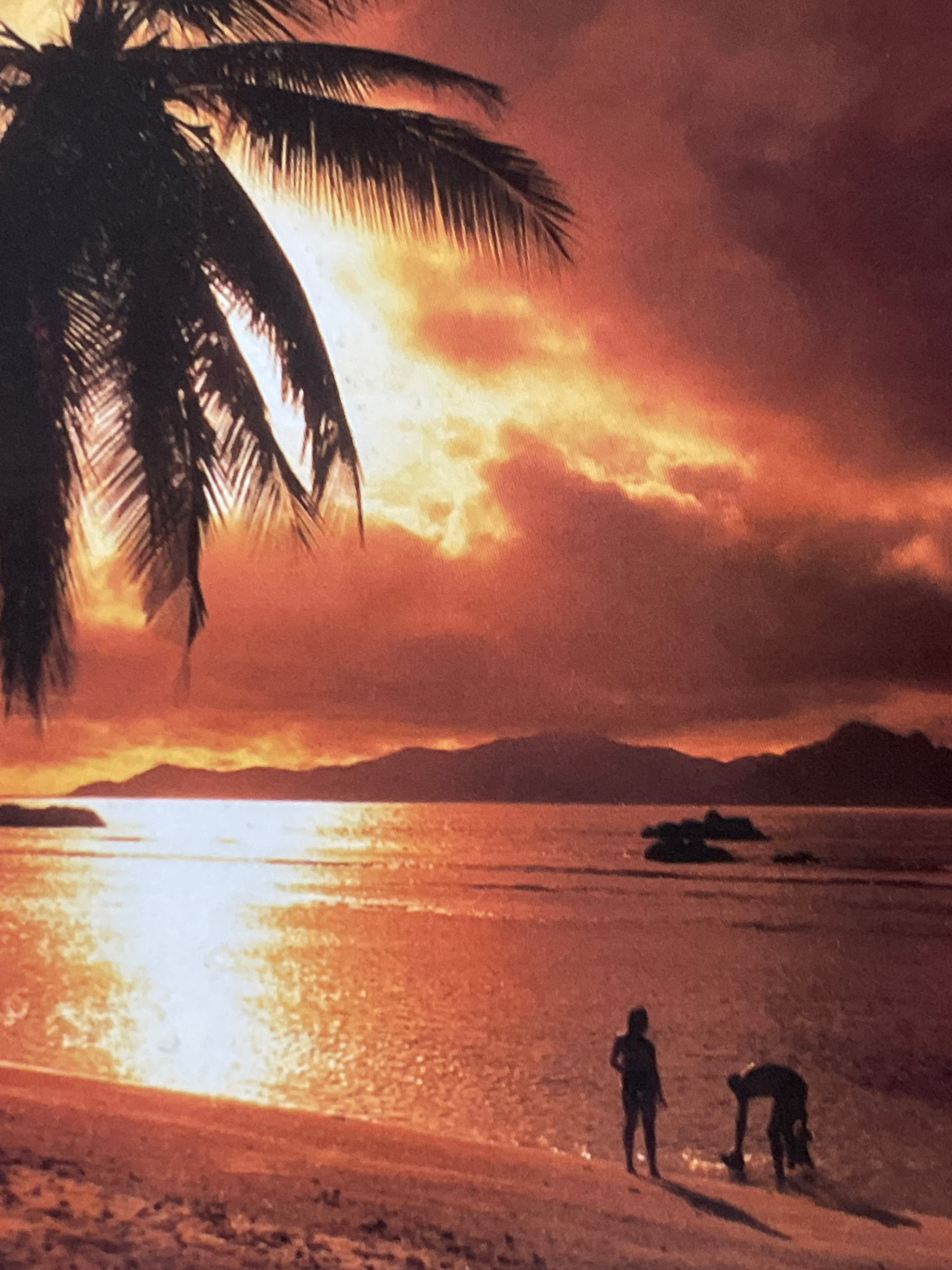 The image shows a beach scene at sunset. A palm tree is silhouetted in the foreground, with a fiery sky and clouds behind it. On the beach, silhouetted figures of people are visible. The specific loca…read more