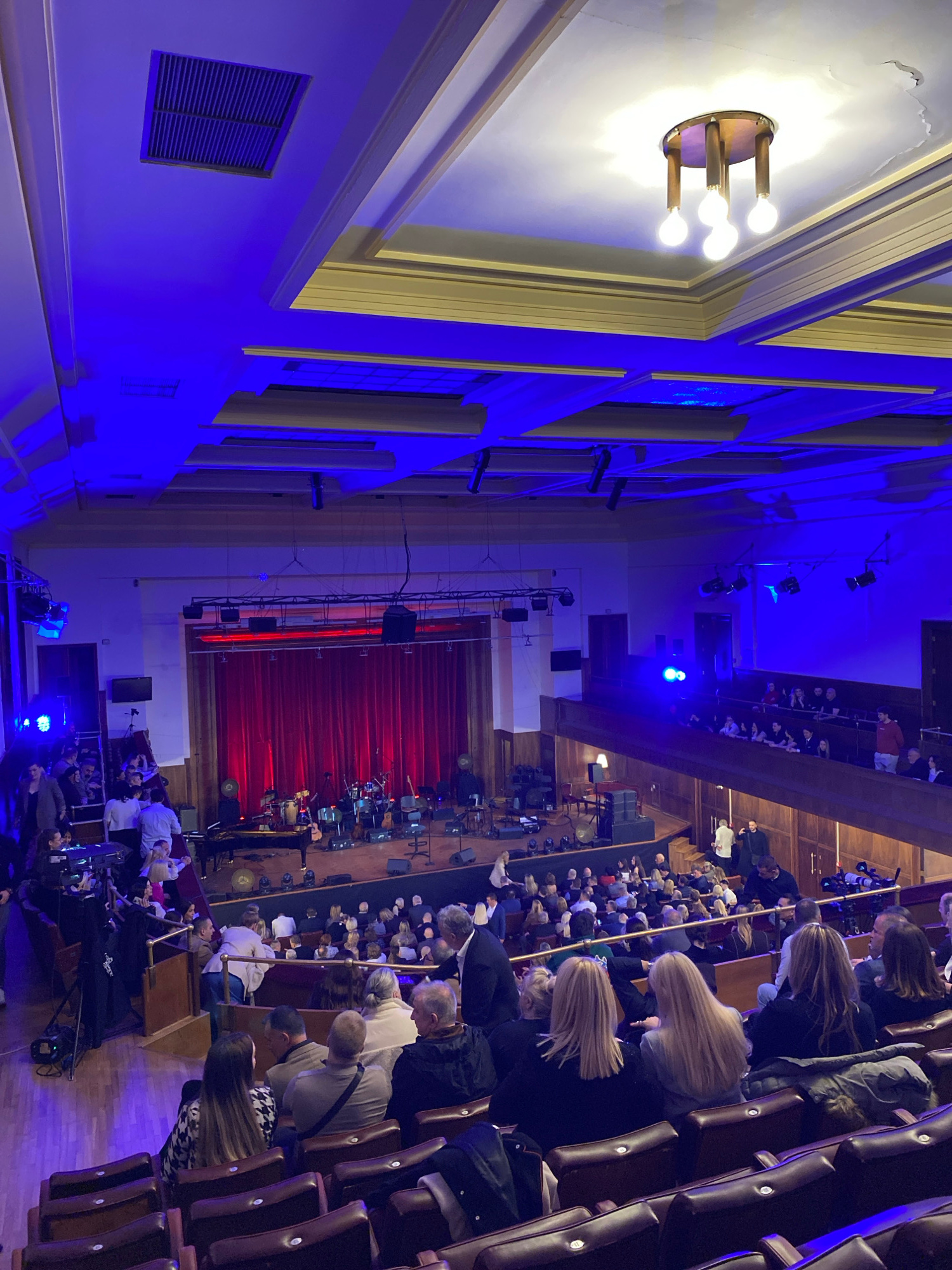 The image shows an auditorium filled with people, likely at a concert or performance, in Belgrade, Serbia. A red curtain drapes the stage, which is set up with musical instruments, including a piano a…read more
