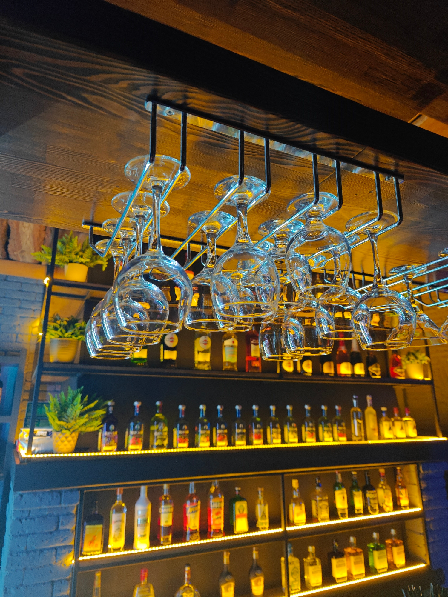 The image depicts the interior of a bar in Chaikovsky, Russia. A wooden ceiling supports a metal rack holding numerous empty wine glasses upside down. Below, shelves lined with various liquor bottles…read more