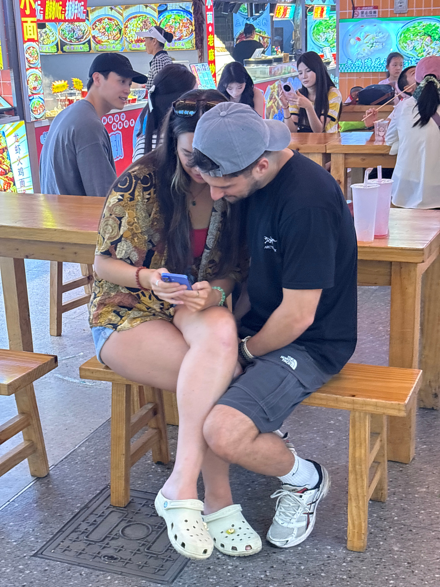This image captures a vibrant street food market scene in Yuzhong District, China, likely during the day or early evening. The setting features simple wooden tables and stools, typical of casual outdo…read more