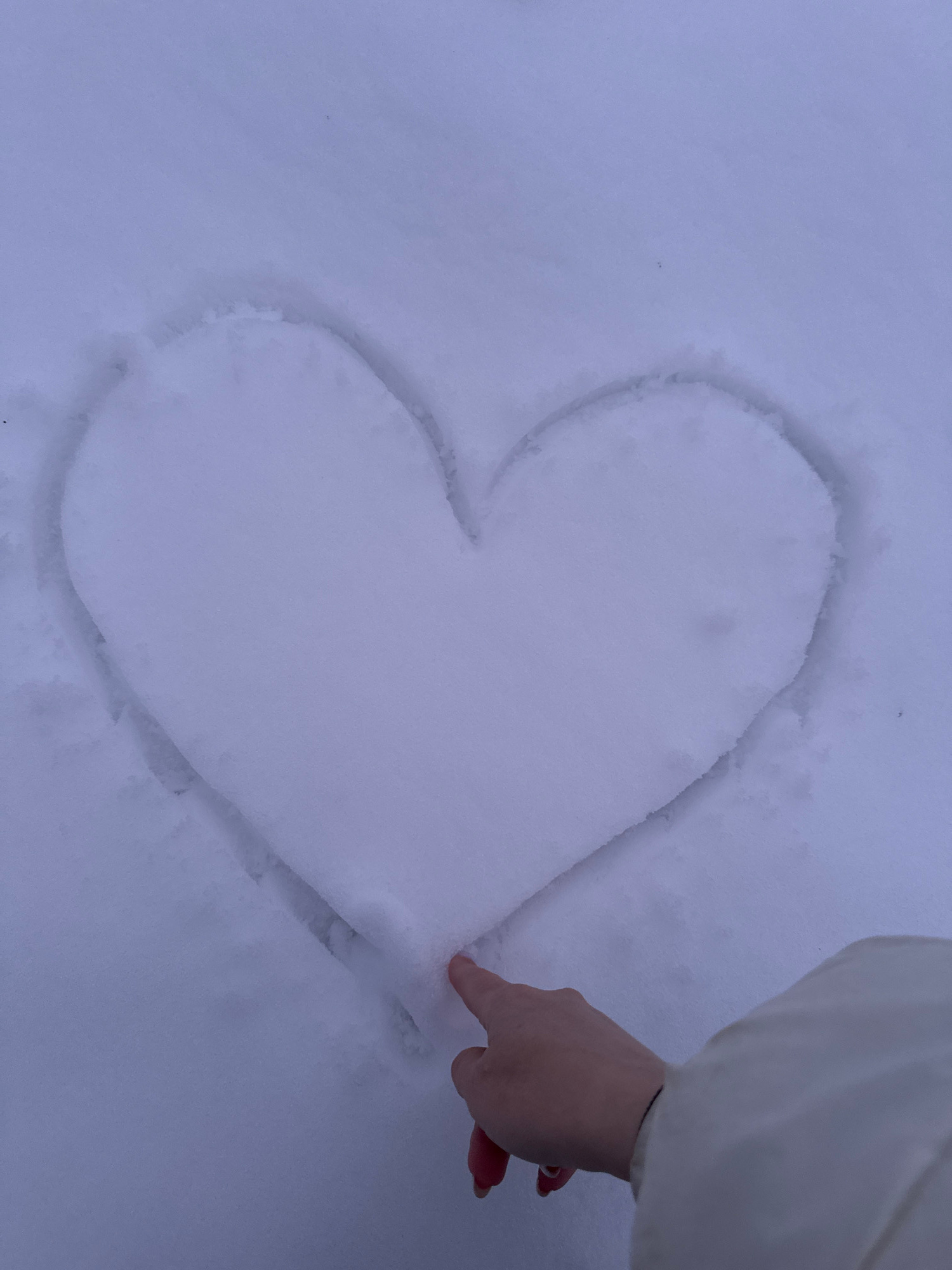 A person's finger points at a heart drawn in the snow. The person is wearing a light-colored jacket. The scene is otherwise covered in snow. There is no indication that this scene takes place in Васся…read more