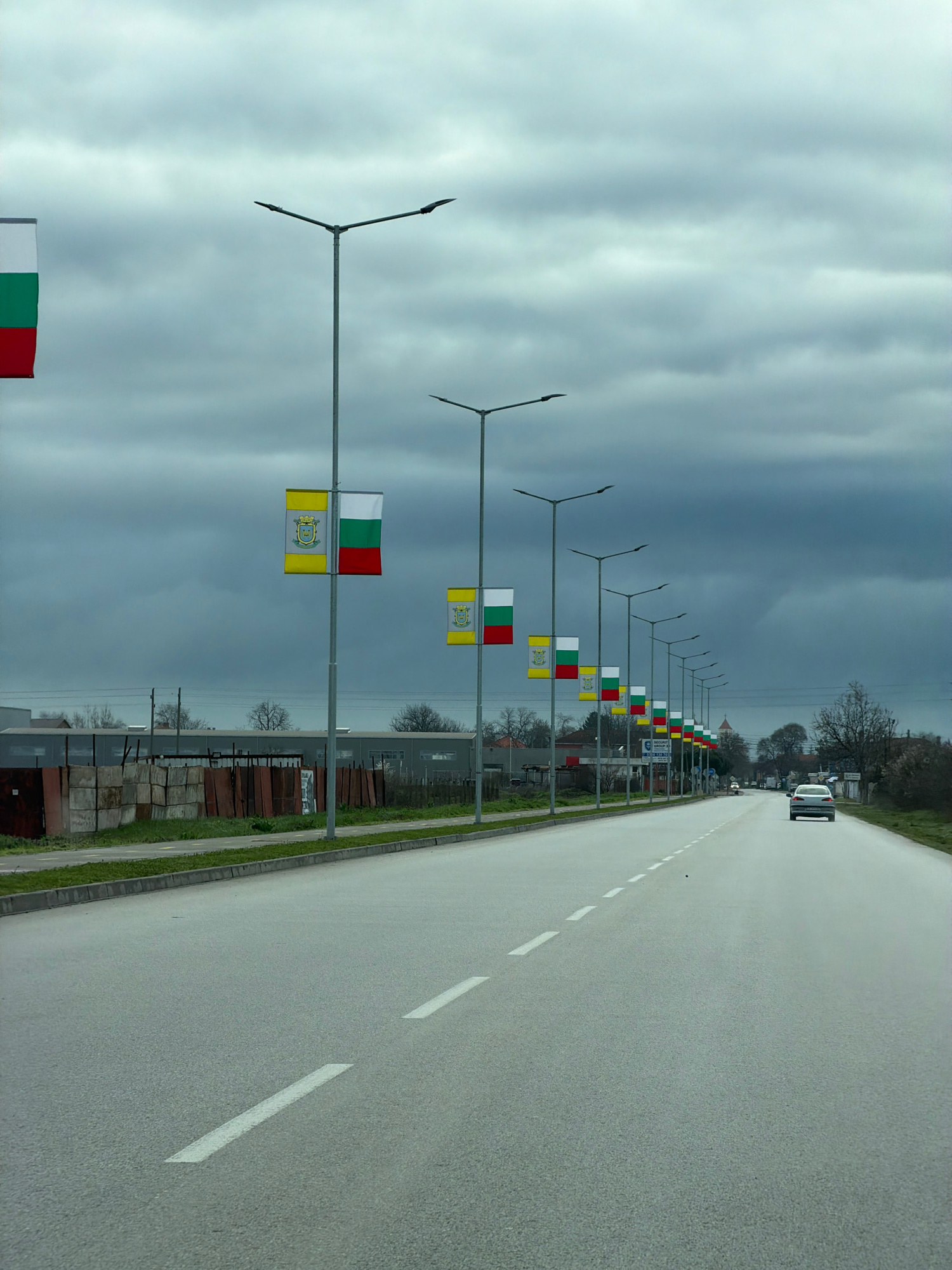 The image shows a road in Rakovski, Bulgaria lined with alternating Bulgarian national flags (white, green, red) and the flag of Rakovski (yellow with coat of arms). The flags are mounted on street li…read more