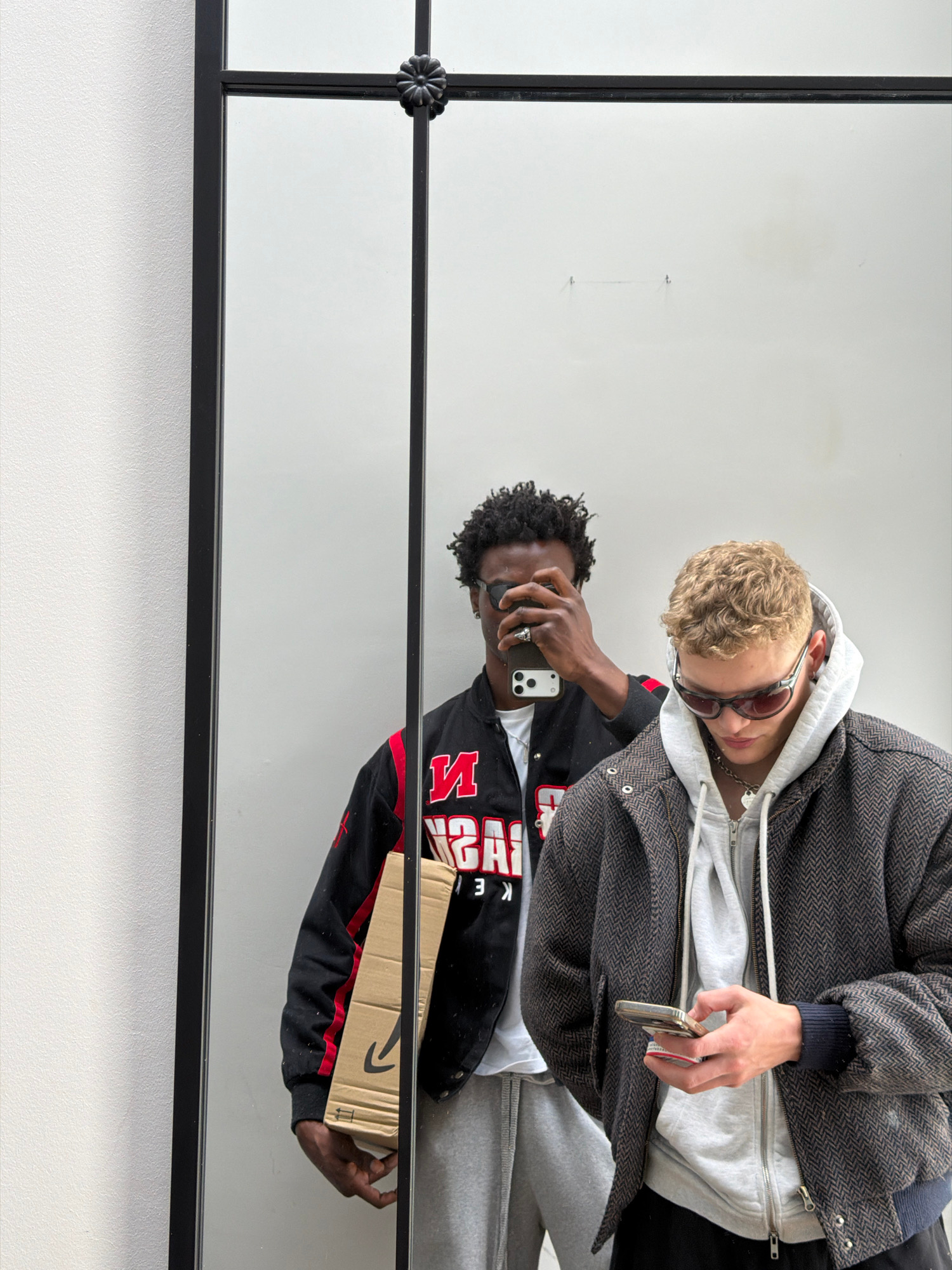 A mirror selfie shows two individuals. One, with blond curly hair, wears a grey hoodie under a herringbone jacket, holding a phone. The other, of African descent with curly hair, wears a black and red…read more