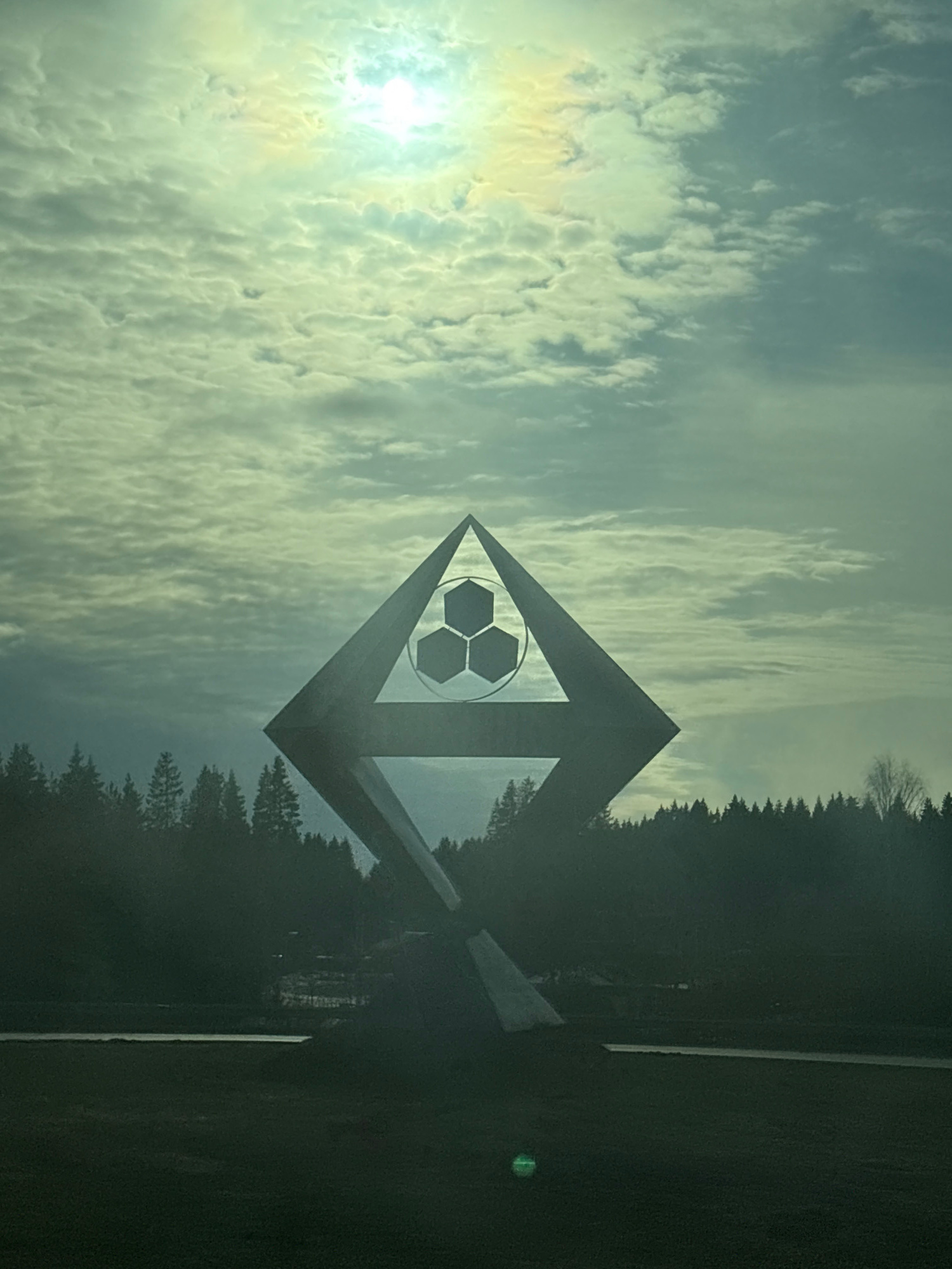 A sideways-oriented, slightly overcast daytime shot captures a soccer-themed monument against a backdrop of trees and sky. The monument features a diamond-shaped frame with a soccer ball design in the…read more