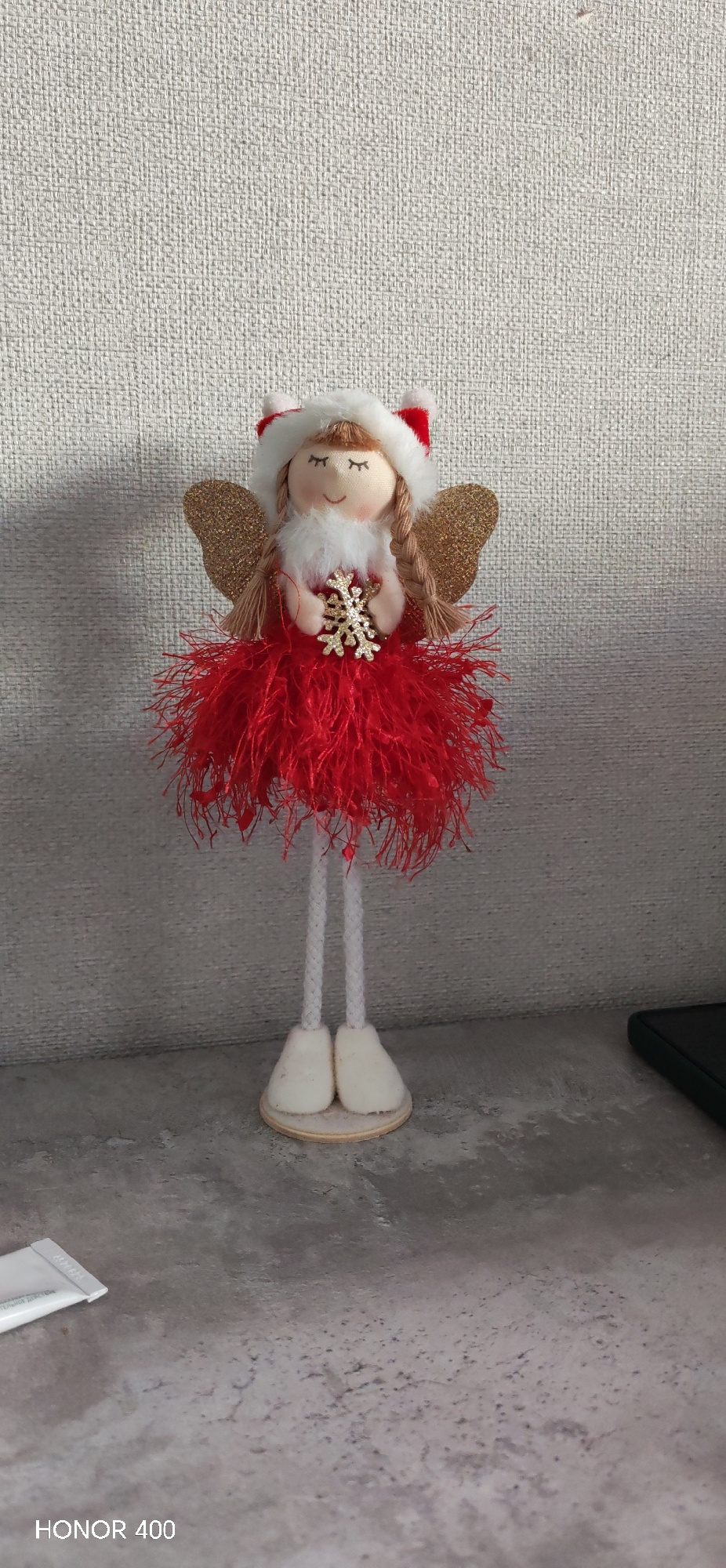 The image shows a decorative angel doll with a red dress and golden wings, standing on a table against a textured wall. The doll is holding a golden snowflake. "HONOR 400" is printed in the bottom lef…read more