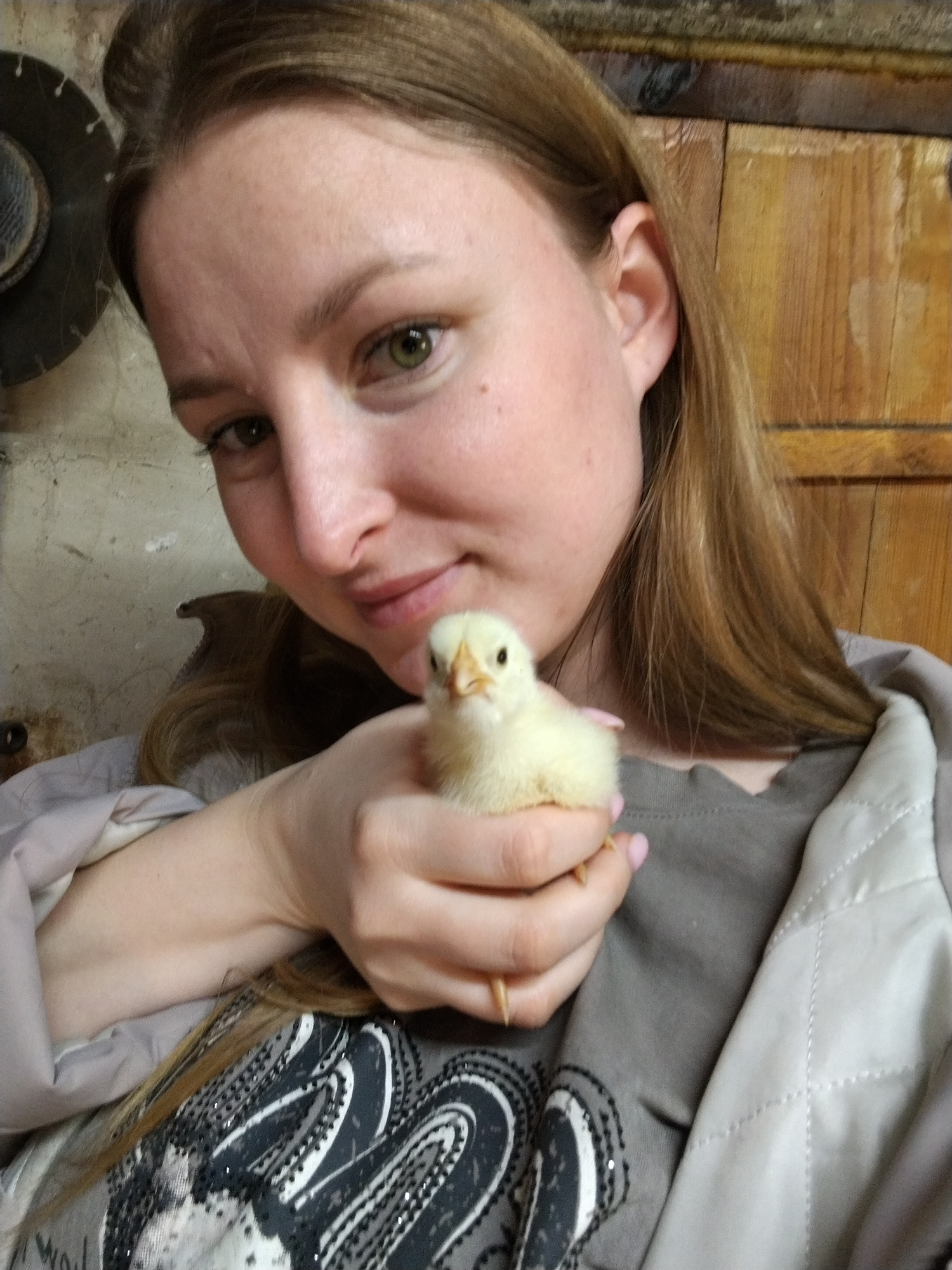 A woman is holding a small, yellow chick. The woman has light skin, brown hair, and green eyes. She is wearing a gray t-shirt with a black and white design, and a light-colored jacket. The chick is in…read more