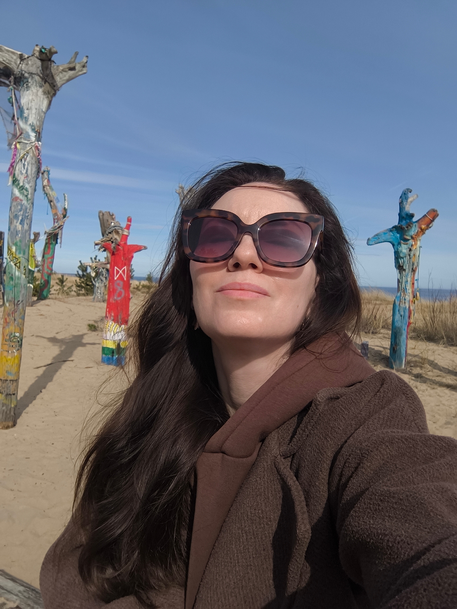 The image depicts a woman taking a selfie at the Gauja seaside nature reserve in Gauja, Latvia. The background consists of a sandy beach with multiple wooden totem-like structures of various colors an…read more