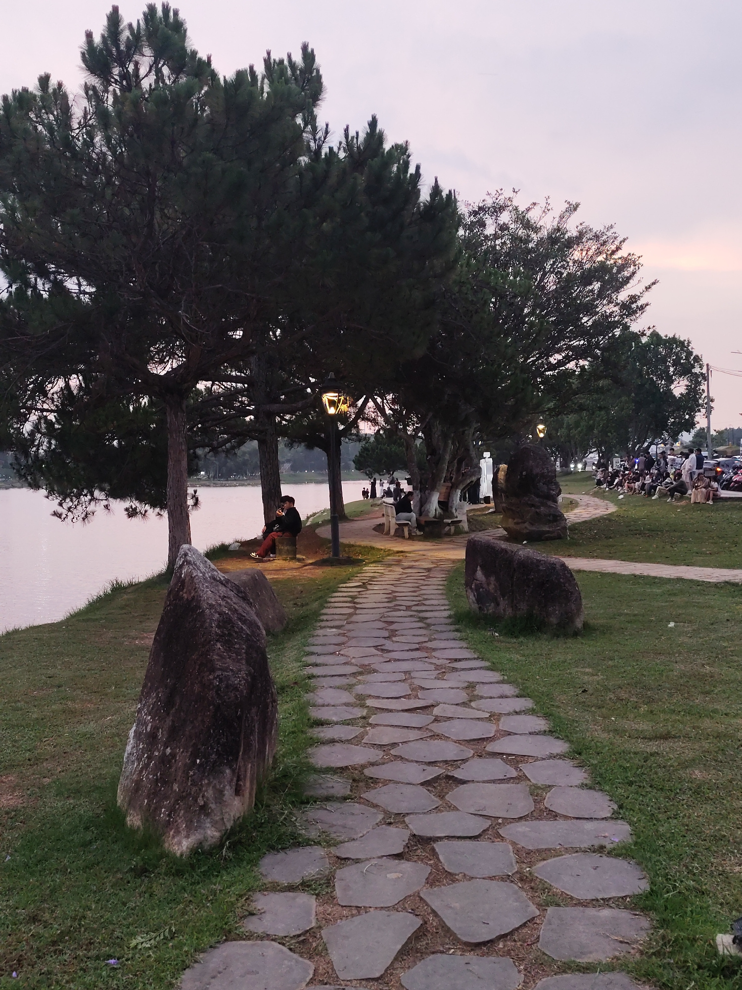 The image depicts an evening scene by a lake in Da Lat, Vietnam, characterized by a tranquil atmosphere as dusk settles. A winding pathway, paved with irregular gray stone slabs, forms the central foc…read more