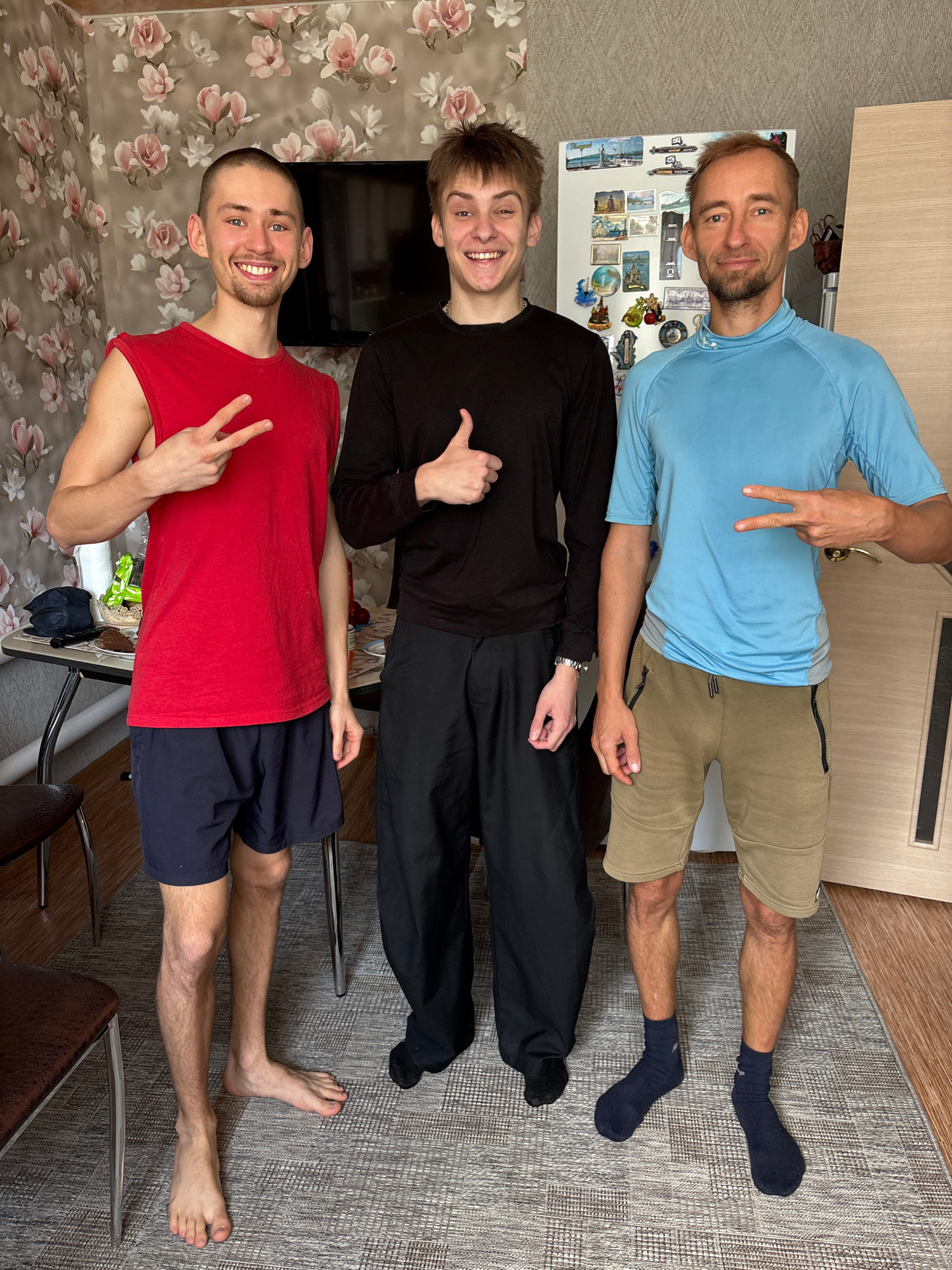 Three men pose indoors. The top man wears a light blue shirt, khaki shorts, and dark blue socks. He is giving a peace sign with his left hand. Behind him is a refrigerator covered with magnets. The mi…read more