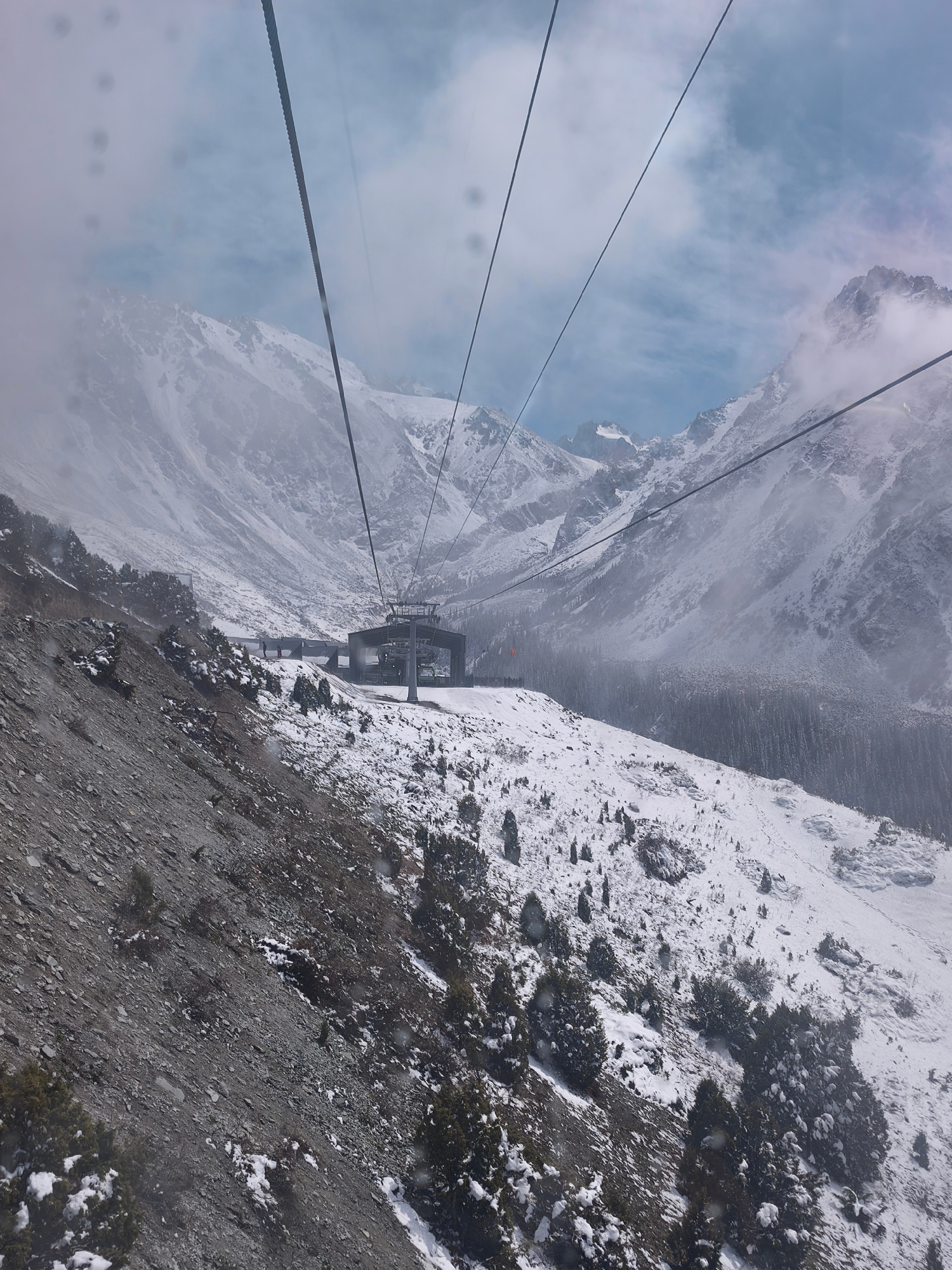The image depicts a mountainous, snowy landscape in an unknown city in Kyrgyzstan, viewed from a cable car. In the foreground, a steep, rocky slope covered with sparse vegetation is partially covered…read more